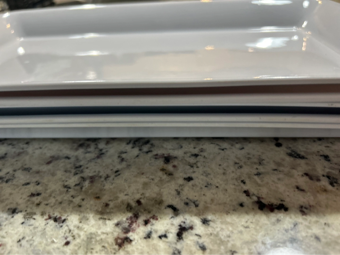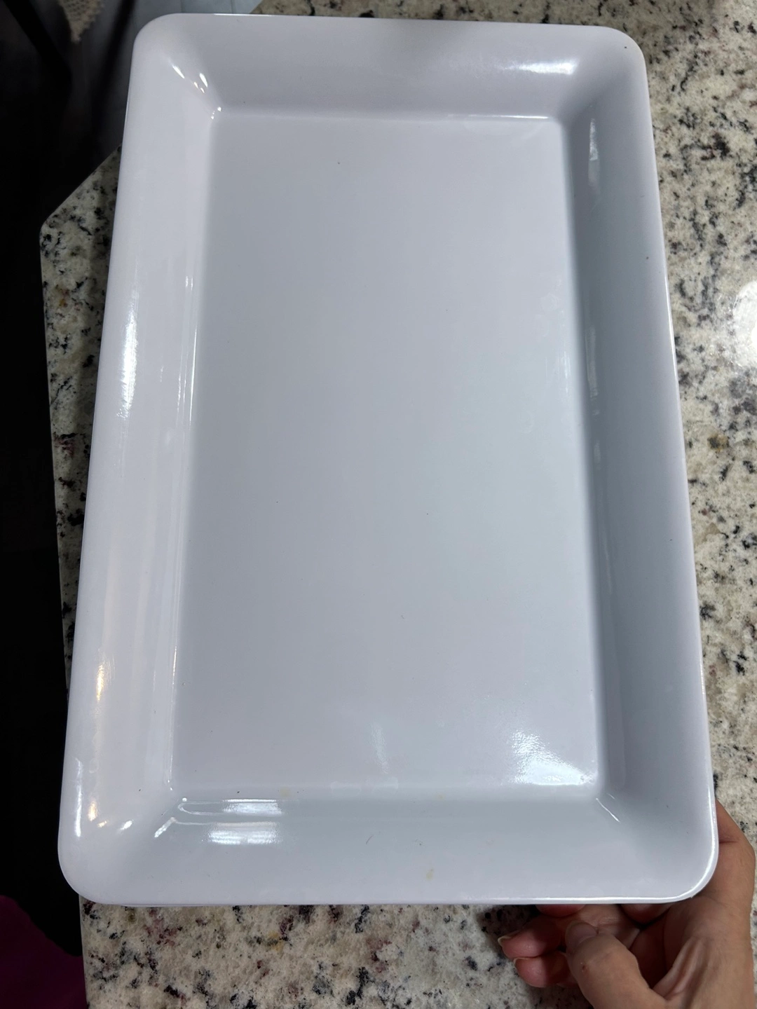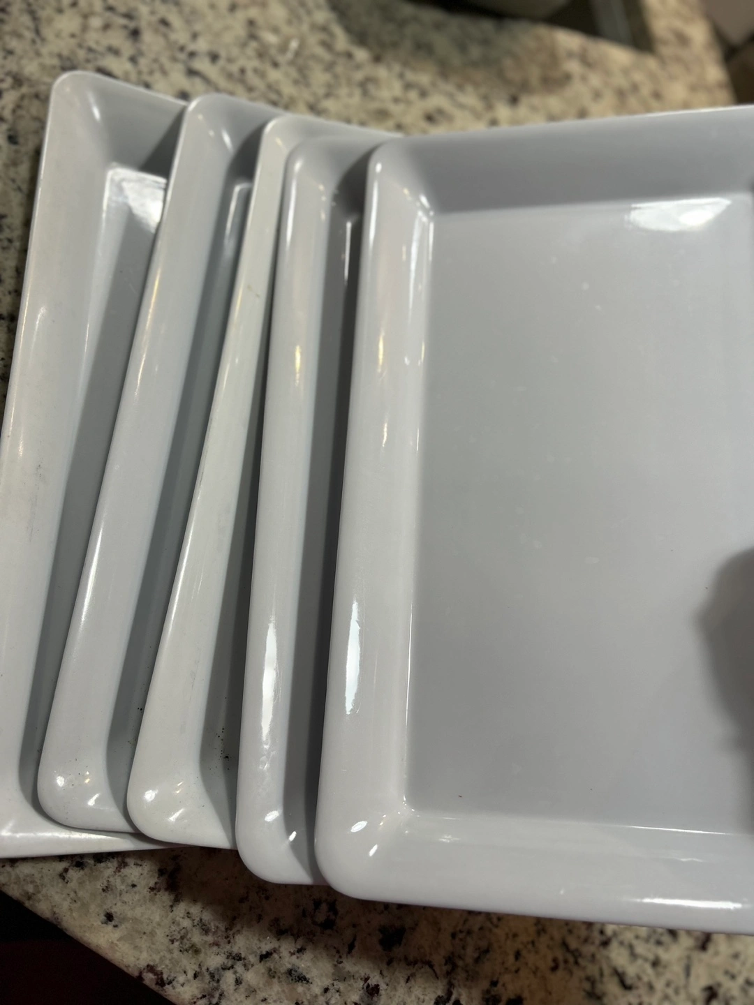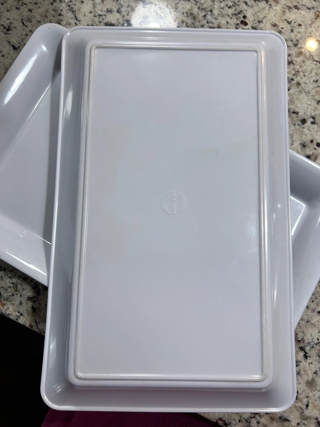 Two rectangular melamine serving platters. White colour. Great for parties or everyday use. Made of strong melamine.