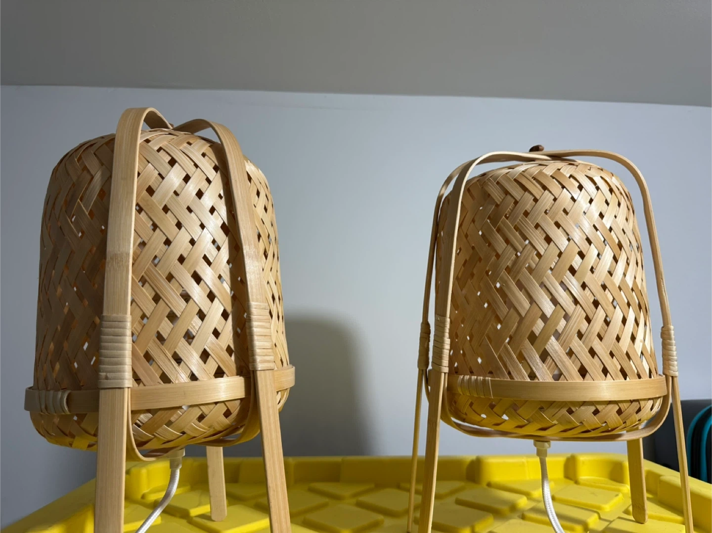 These are two cute woven bamboo table lamps! They would look great in any room, adding a touch of natural warmth and texture to your space