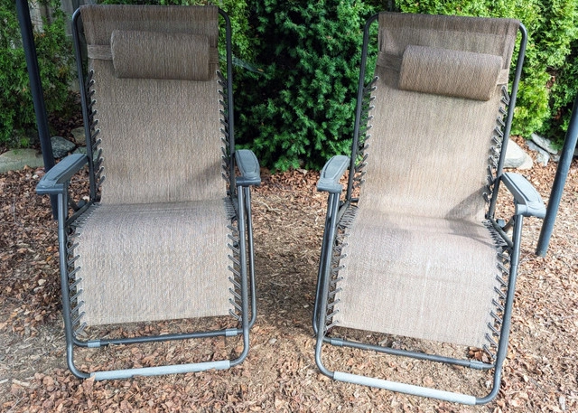 If you are seeing this Ad, then this item is still available This sale is for 2 very nice and clean Zero Gravity Chair/Recliner Beige. These chairs offer the ultimate portable comfort, allowing you to put the chair in multi positions. The adjustable headrest is provided for additional comfort or use as lumbar support. Perfect for backyard, beach or sporting event. Key Features: • Heavy Duty Powder-Coated Steel Frame • Weather-Resistant Fabric • Folds For Easy Storage • Dimensions: Approximately 26.6 in W x 35.4 in L x 44.4 in H. • Weight Capacity: 136 kg (300 lbs). Pick-up in Pickering ONLY This item comes from a smoke-free home