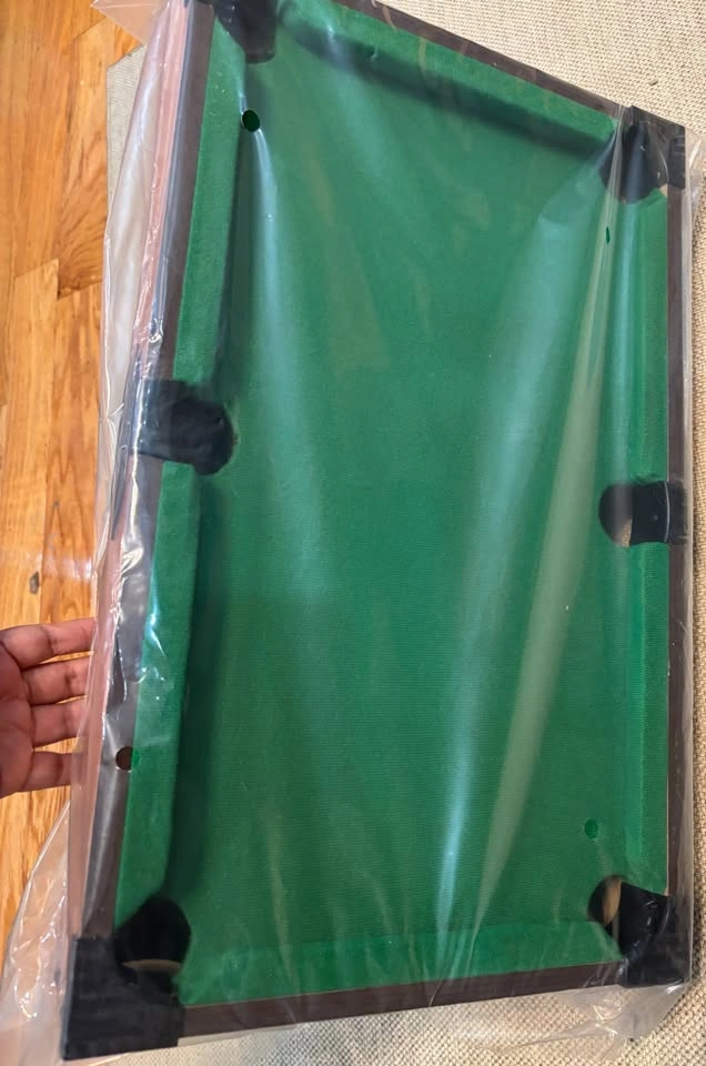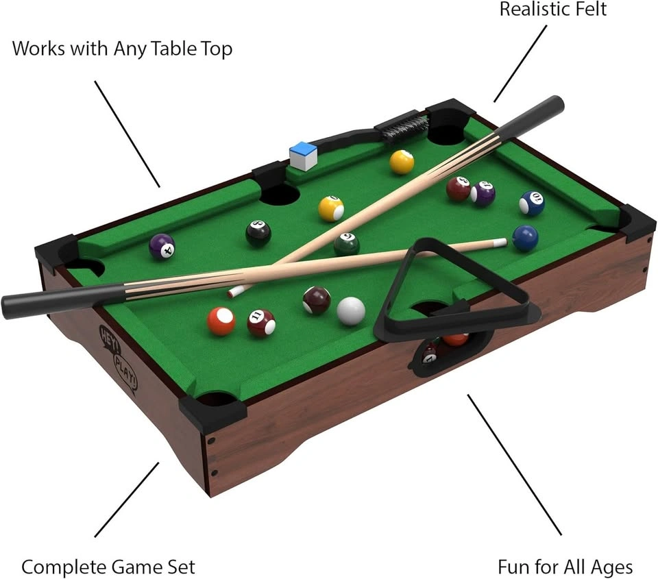 Compact 20" Portable Tabletop Pool Game New in box Pickup in Barrhaven, Mountshannon and Daventry street intersection. 20-inch long tabletop pool table, compact and portable Includes 2 cue sticks, 16 mini pool balls, chalk, triangle rack, and brush Mini 1-inch balls and 18.75" cue sticks for realistic gameplay Wood construction with green felt playing surface Perfect for parties, game nights, travel, or teaching beginners Easy to store on a shelf or in a closet Lightweight at 2.7 kg, no assembly required Suitable for ages 14+