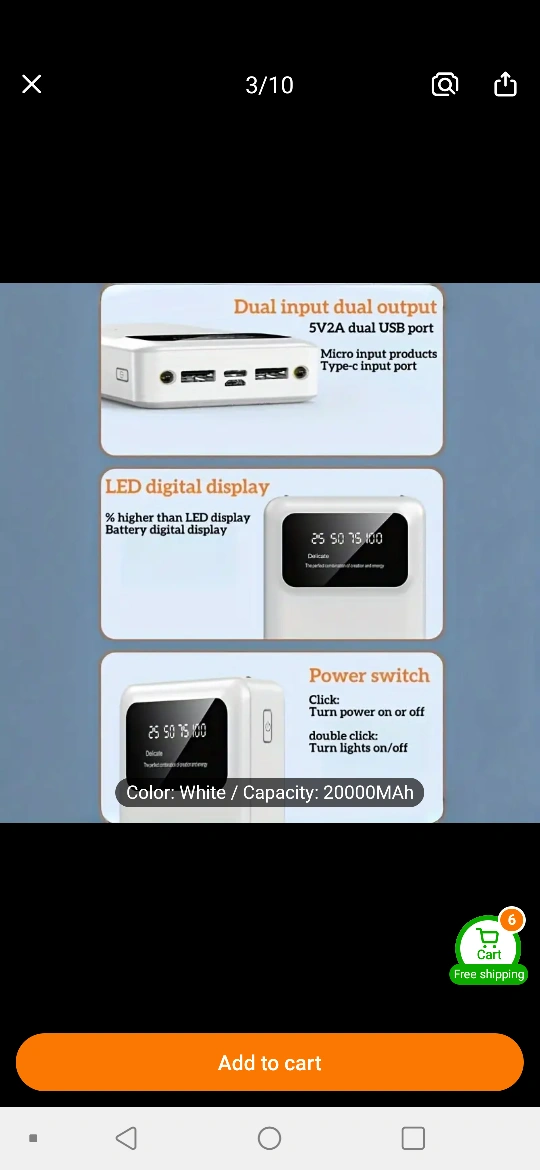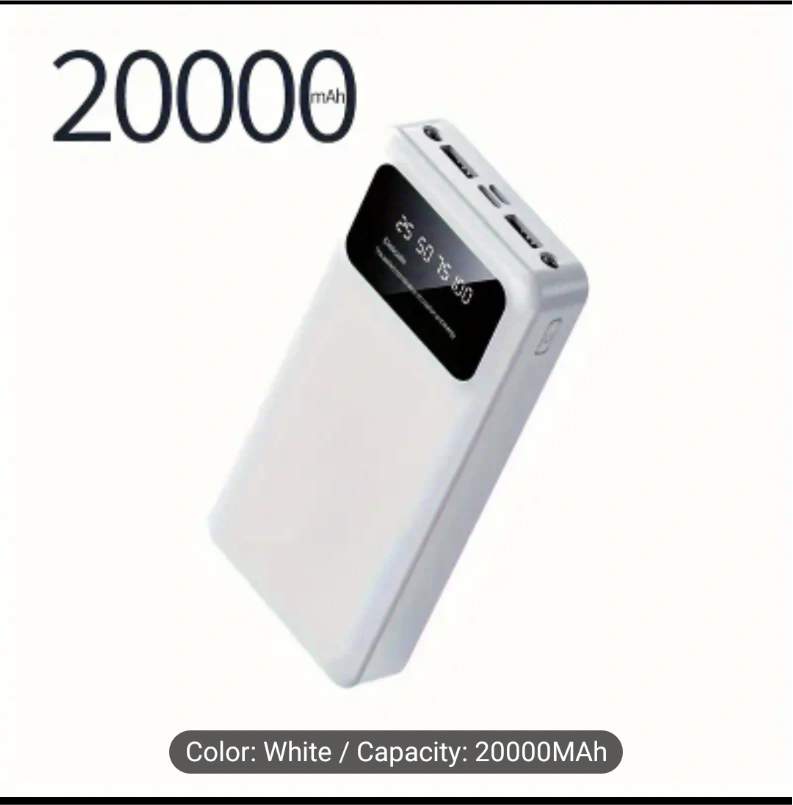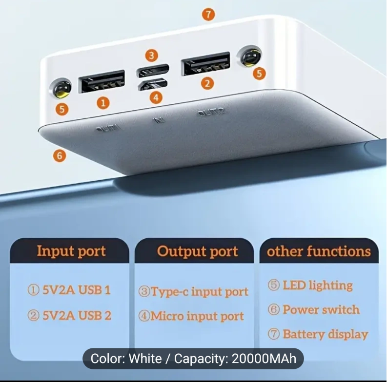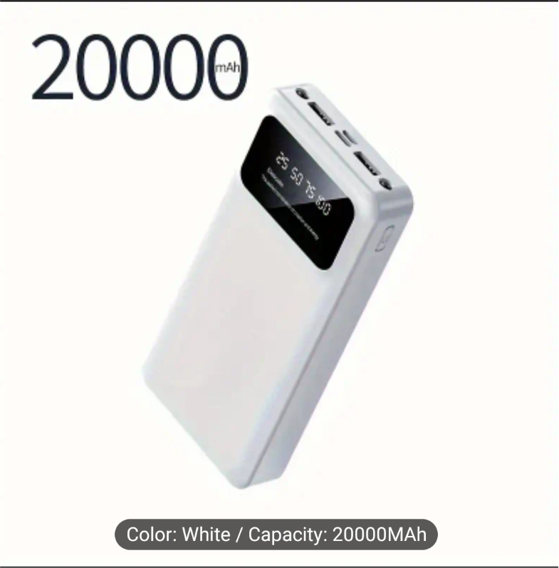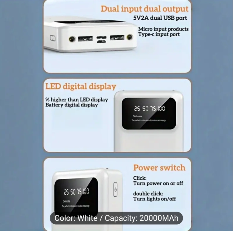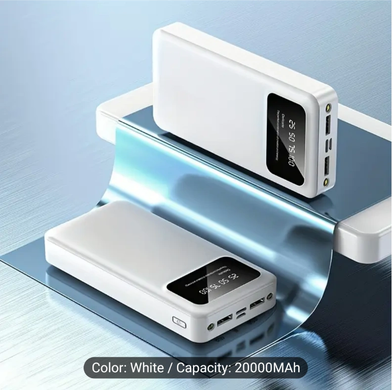 White power bank. 20000mAh capacity. Dual input, dual output. Features LED digital display, power switch, and multiple ports including USB, Micro, and Type-C.