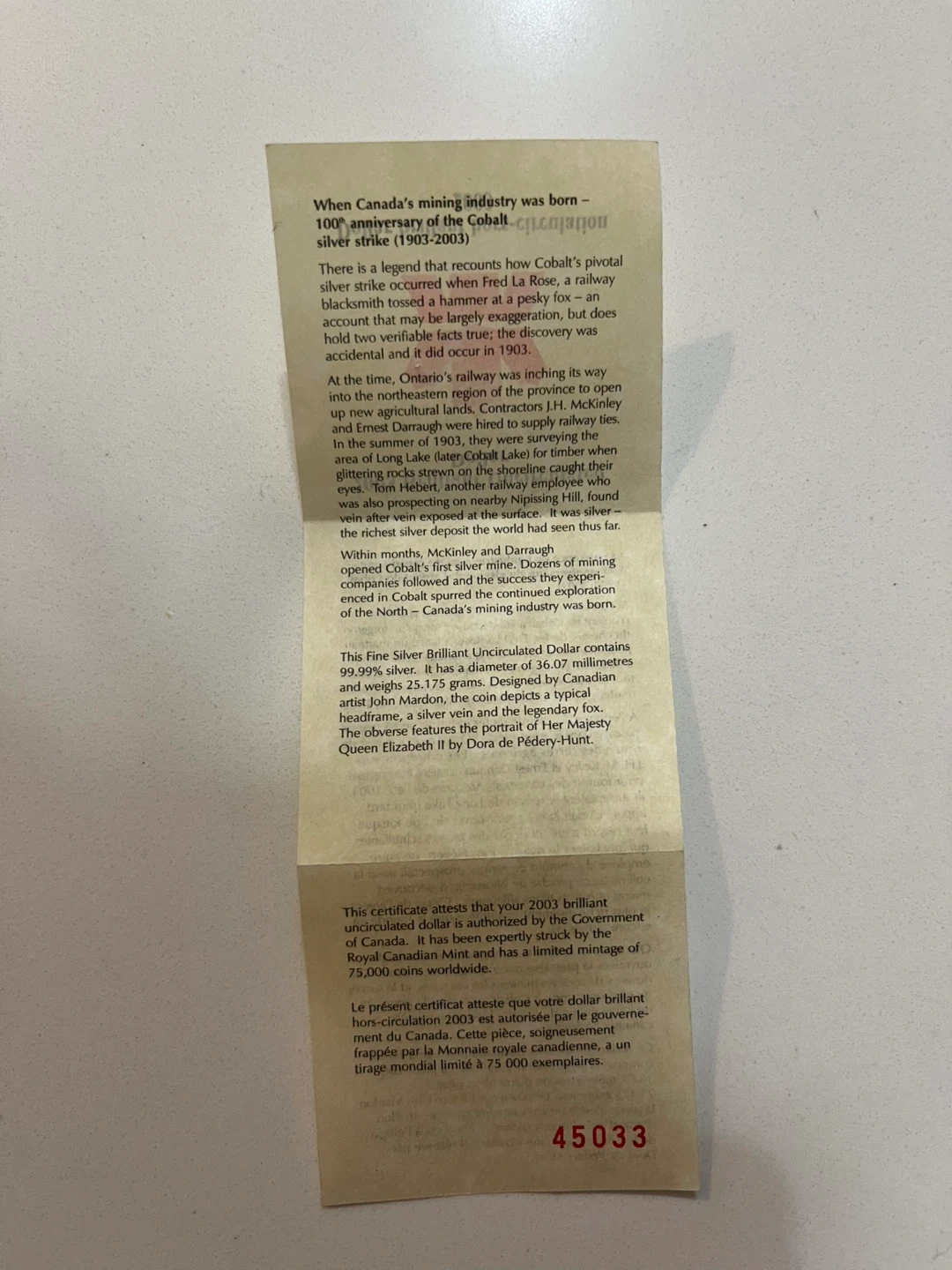 Selling a 2003 Brilliant Uncirculated Dollar coin. This fine silver coin contains 99.99% silver and has a diameter of 36.07 millimeters. It was designed by Canadian artist John Mardon and features the portrait of Her Majesty Queen Elizabeth II by Dora de Pedery-Hunt. The coin is authorized by the Government of Canada and has a limited mintage of 75,000 examples worldwide