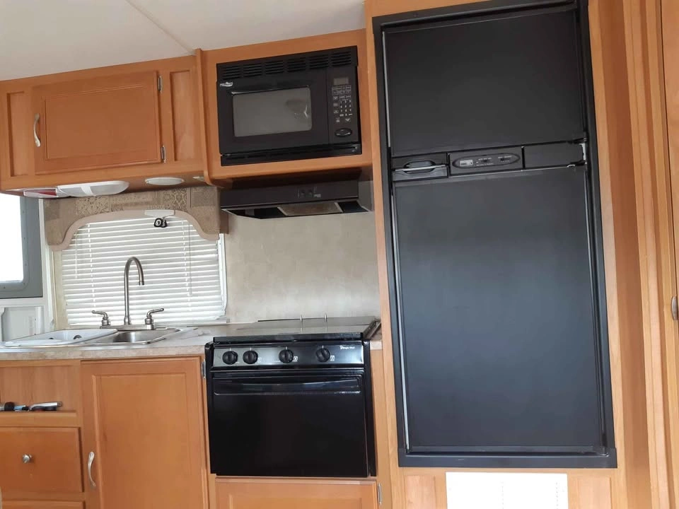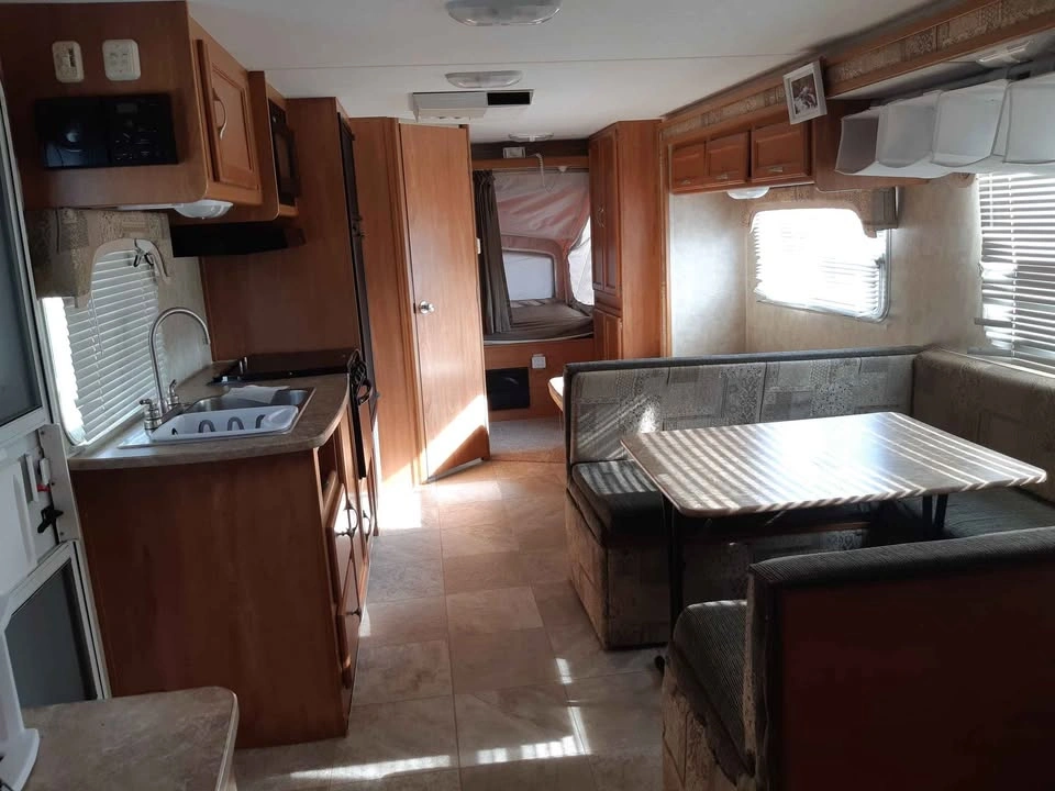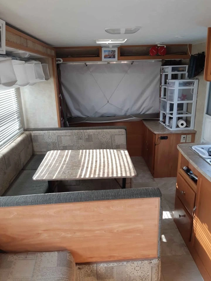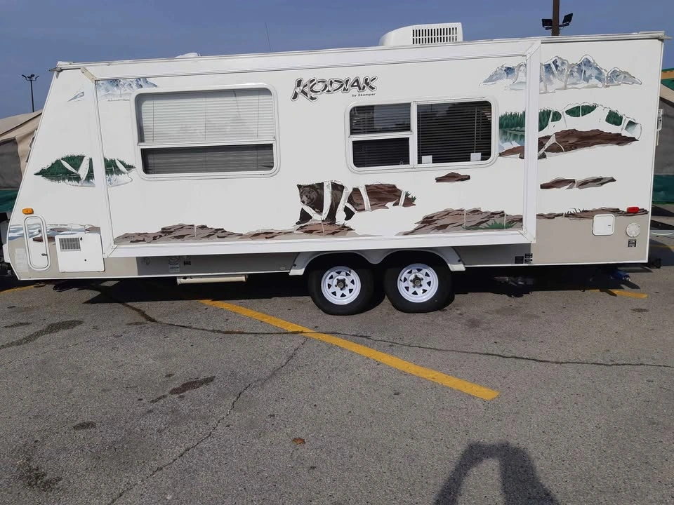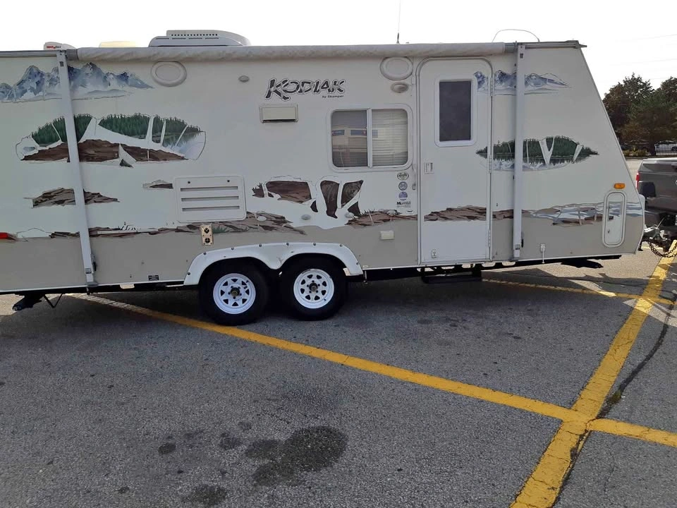 2007 Kodiak by Scamper Model 214. I have the ownership. Tires= ST205/75R14 (C) 50psi Trailer= GVWR 2195KGS 4840lbs Empty Trailer tongue 4ft from trailer Trailer width= 100 inches Wheel well 3 inch over hang No roof leaks that I know of and safe to walk on Roof was checked Aug 10th 2025 Overall length with rear bed open 30ft long Overall length from the front of the tongue to the rear bumper is 25ft (with rear bed closed) Dual axle Tires= ST205/75R14 50psi Upgraded tongue power jack And moved back so a truck tailgate can open while hooked up to the trailer Working Fridge/freezer Gas/AC/ Working hot water tank Gas/AC/ Working Air conditioning New thermostat installed AC power only Working Gas stove and oven Gas Working microwave AC power only 12ft long slide out with Jack couch and U shaped dining area. Hideaway spare tire underneath the trailer. Pickup north Oshawa Ritson and Winchester. Free storage of the Trailer in North Oshawa April 2026.