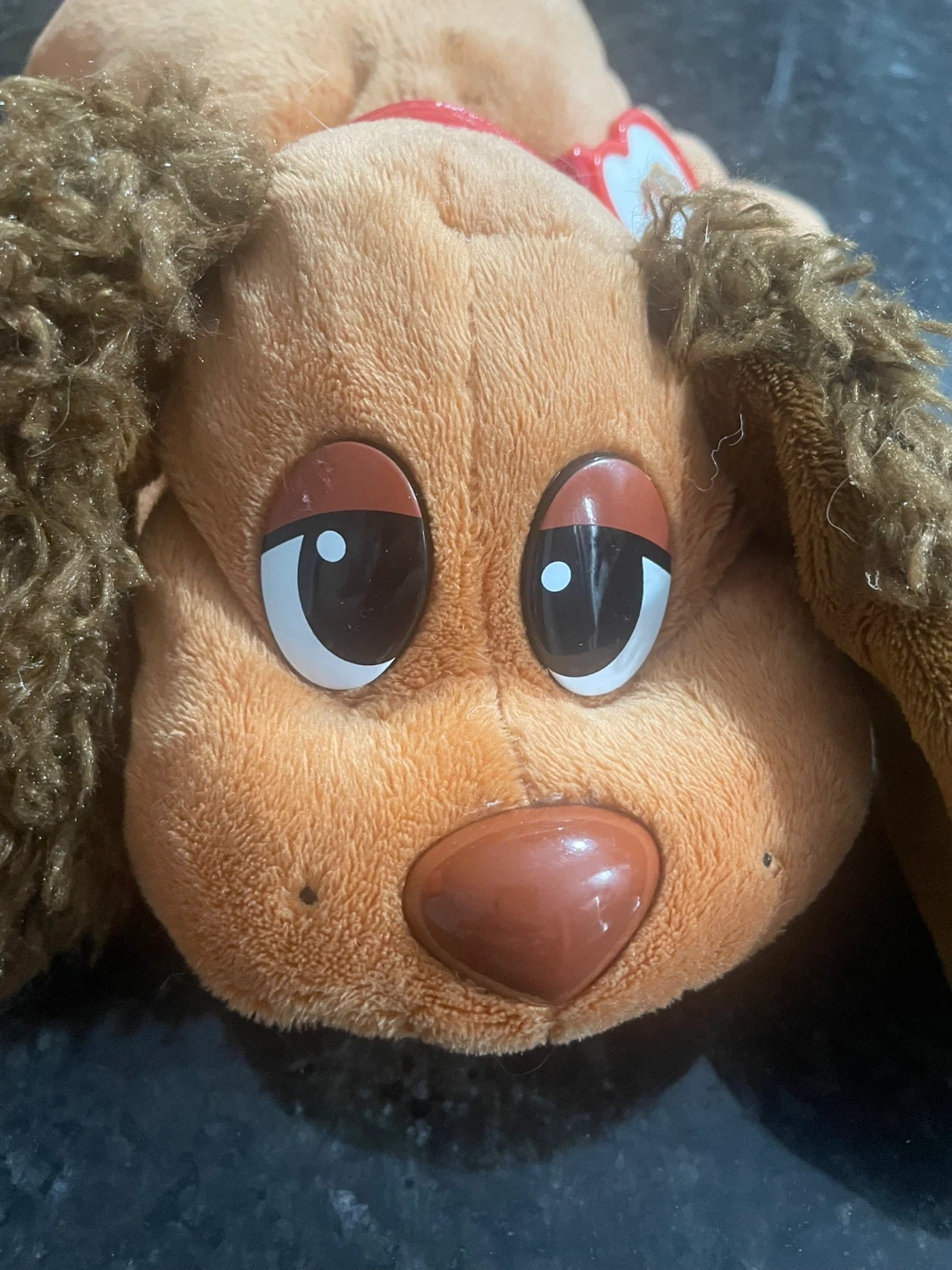 A cute and cuddly Pound Puppies plush toy looking for a new home! Pick up in Chappelle.