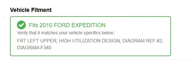 Brand New - Front Left - UPPER; Product Specifications Adjustable No Ball Joint Mounting Type Press In Ball Joint Stud Type Threaded Bushing Material Rubber Bushings Included Yes Control Arm Color Black Control Arm Material Forged Steel Control Arm Maximum Length 13.660 Control Arm Maximum Length(in) 13.660 Grease Fitting Included No Meetsor Exceeds Original Equipment Manufacture Specifications Yes Mounting Hardware Included Yes Part Number CK80306 Pre Greased Yes Fitting Vehicle(s) Year Make Model 2007, 2008, 2009, 2010, 2011, 2012, 2013, 2014, 2015, 2016, 2017 FORD EXPEDITION 2004, 2005, 2006, 2007, 2008, 2009, 2010, 2011, 2012, 2013, 2014 FORD F150 PICKUP 2006, 2007, 2008 LINCOLN MARK LT 2007, 2008, 2009, 2010, 2011, 2012, 2013, 2014, 2015, 2016, 2017 LINCOLN NAVIGATOR