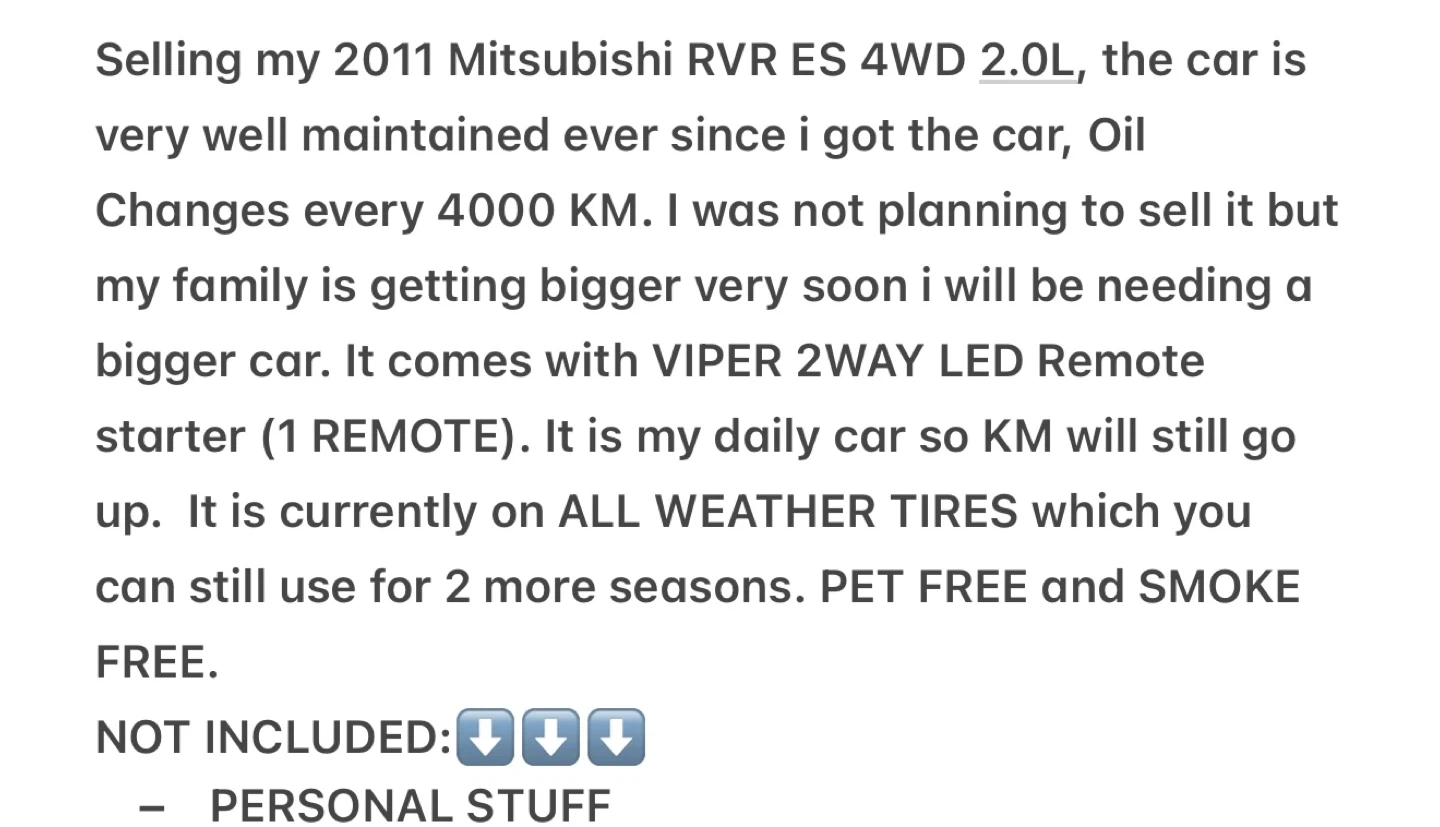 SEE FIRST PICTURE FOR DESCRIPTION ⬆️ 2011 Mitsubishi RVR ES 2.0L 4WD ACTIVE STATUS ALBRTA REGISTERED✅ ✅PRICE IS FIRM✅ PROS:⬇️ -Oil changes every 4,000km -2 Way compustar remote starter -Power windows,Mirrors,Lock and Unlock -Restored and Polish Headlights -HEATED SEATS -AC and HEATER works perfect -New Catalytic converter -New 02 Sensors upstream and downstream -New 4 rotors recently -New 4 Brake pads recently -New Both front lower ball joint -New Transmission fluid -New Both rear differential pinion seal -New battery -New Rear differential fluid -New Rear Left speed sensor -New Coolant -New Rear differential pinion Seal CONS:⬇️ -Body and paint is not perfect as it is an old car -Rust on Both Rear quarter panel (not worst)