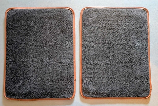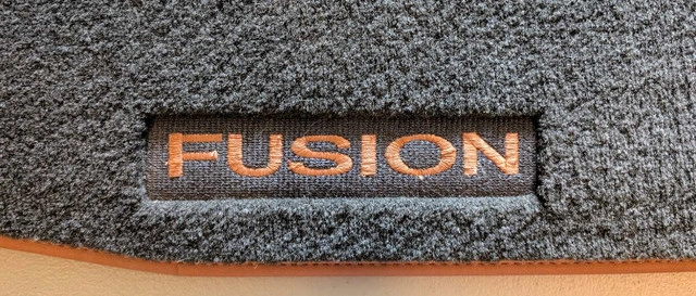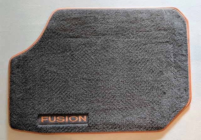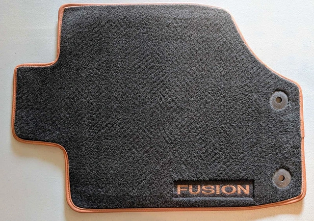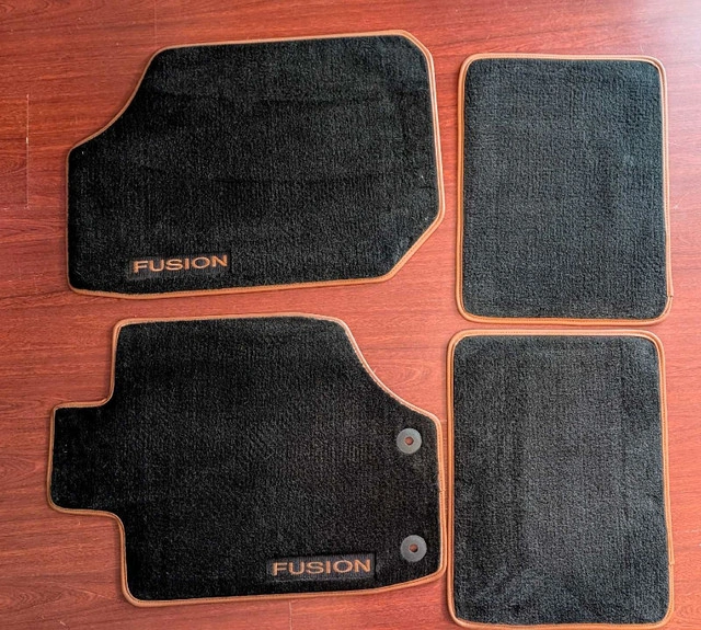 These are the original floor mats from my 2012 Ford Fusion. The mats are black with the 'Fusion' logo embroidered on the front mats. These floor mats are in like new condition and have been in storage for some time. * Set of four floor mats * Colour: Black with orange-tan trim * Embroidered 'Fusion' logo