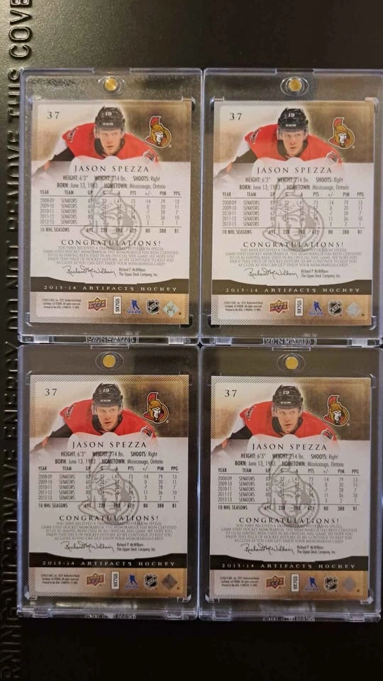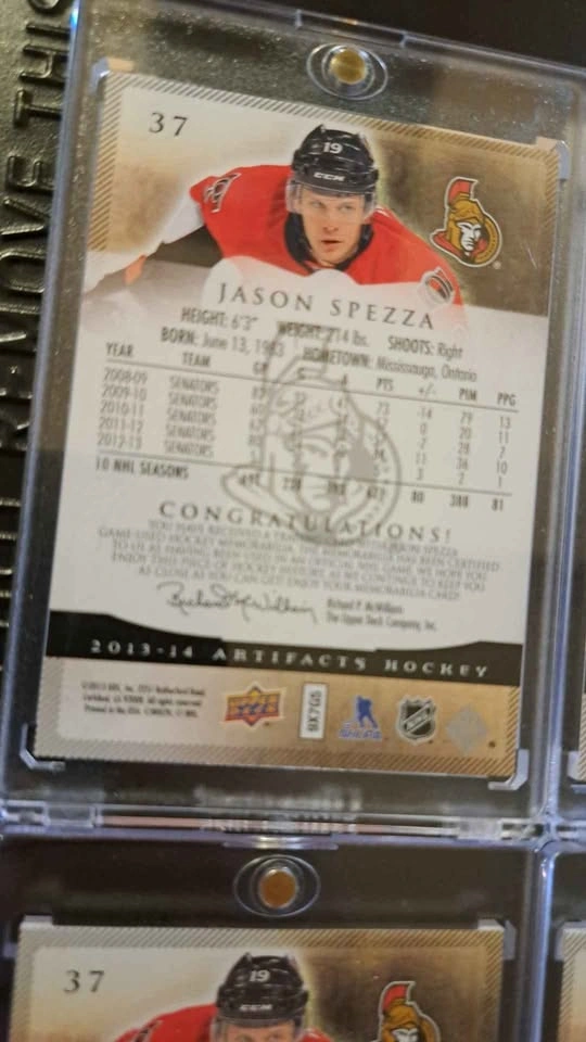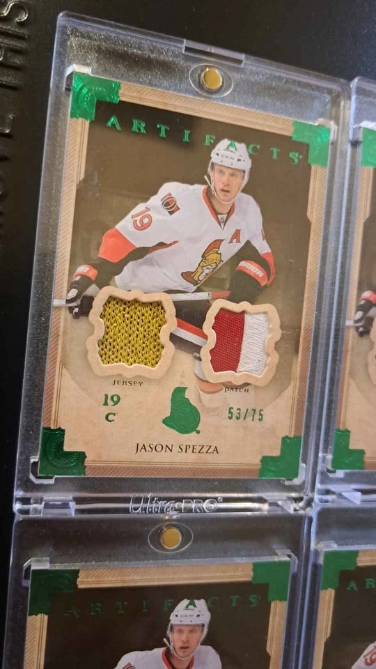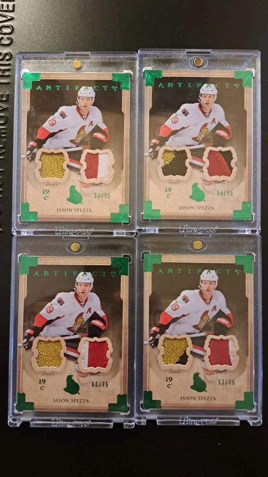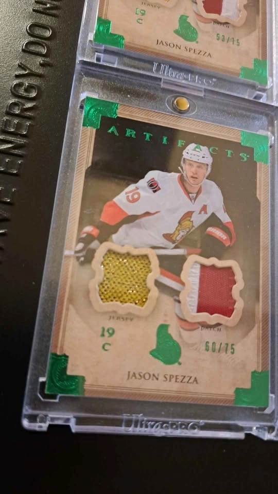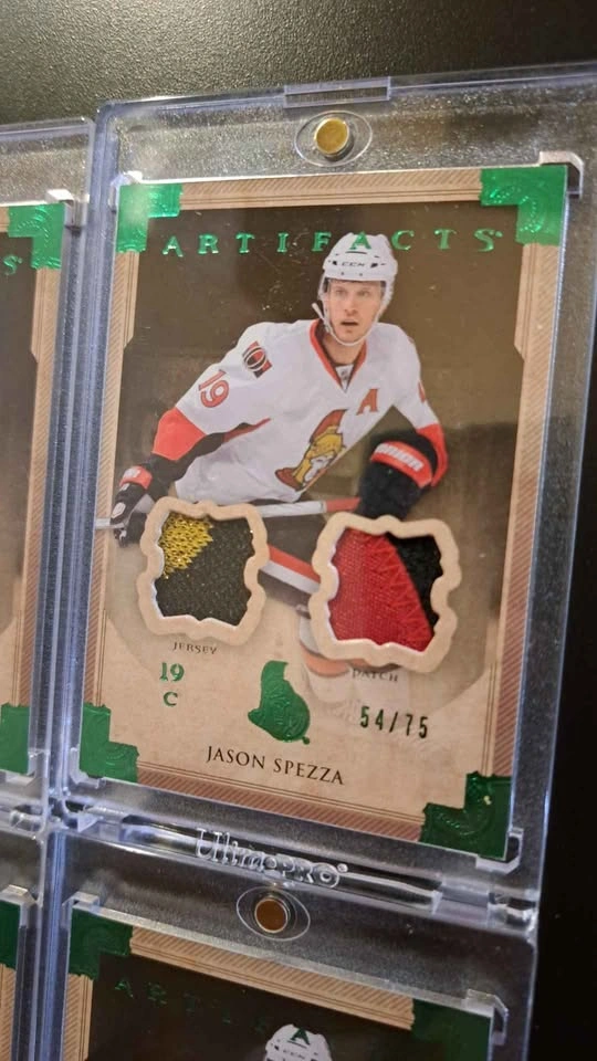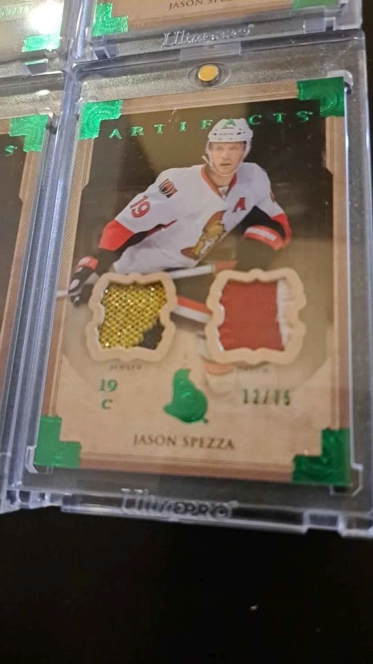 Jason Spezza Upper Deck artifacts emeralds game w o r n materials. All cards are as new as the first day out of the pack. All were immediately set in one touch hard cases. Vivid beautiful materials!
