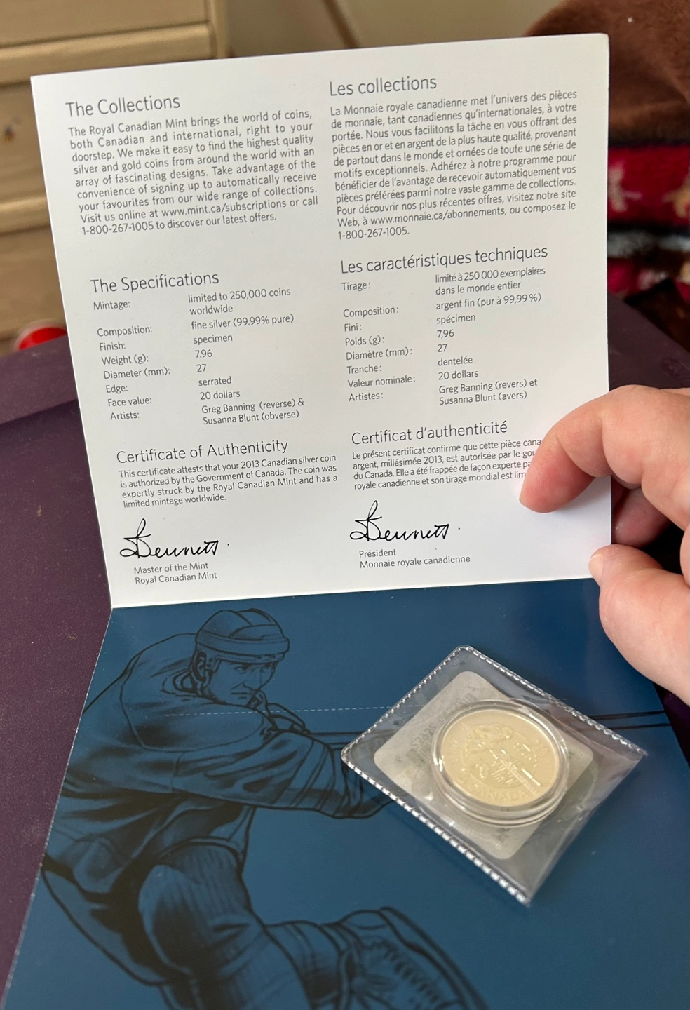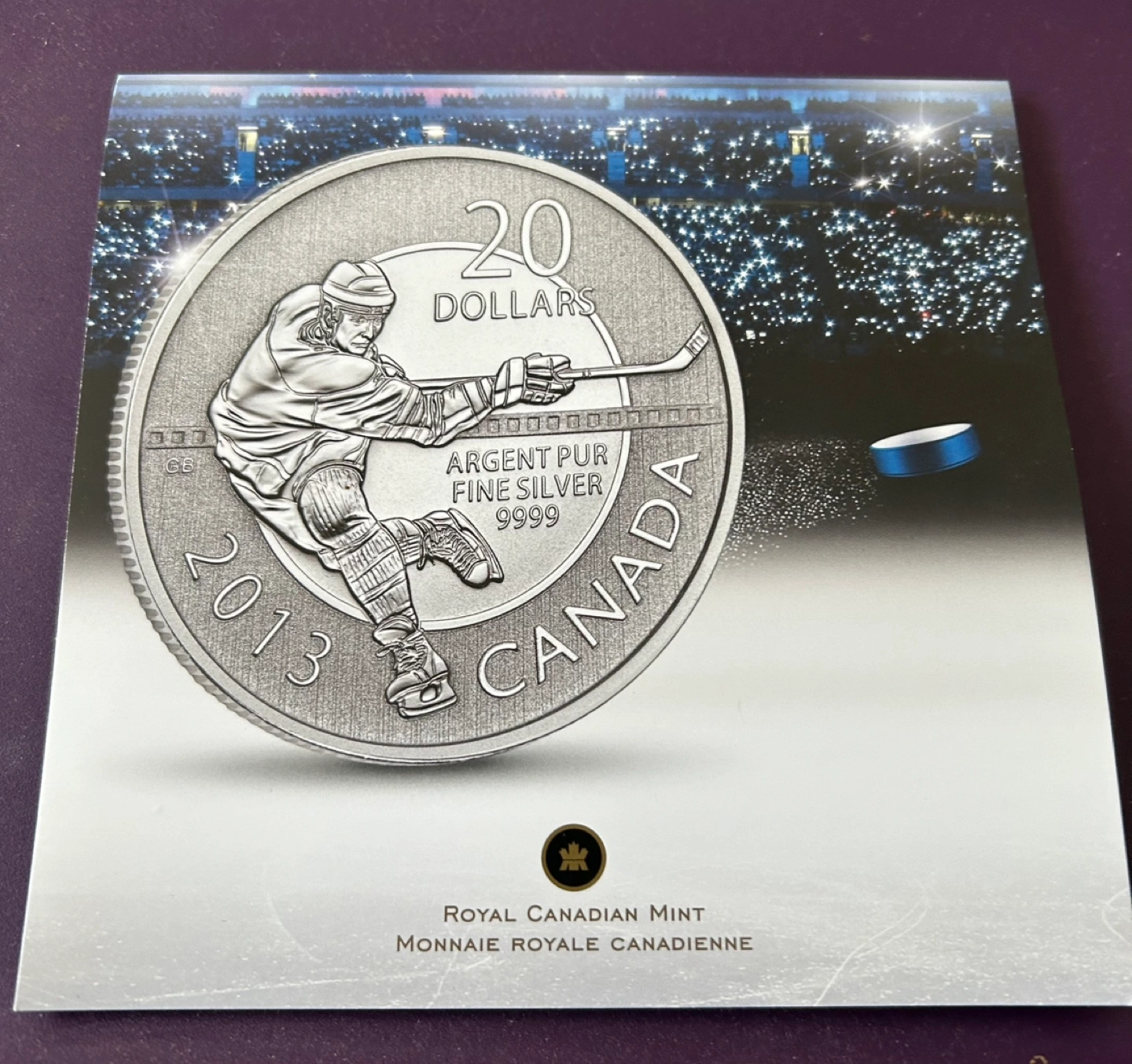 2013 Royal Canadian Mint 20 dollar silver coin. Hockey player design. Comes with certificate of authenticity.