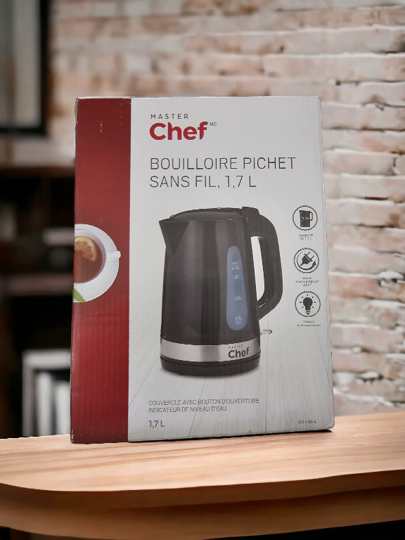Cordless kettle with 360° rotational power base One touch lid release button on-switch with illuminating power indicator light water level windows capacity 1.7L 1500 Watts