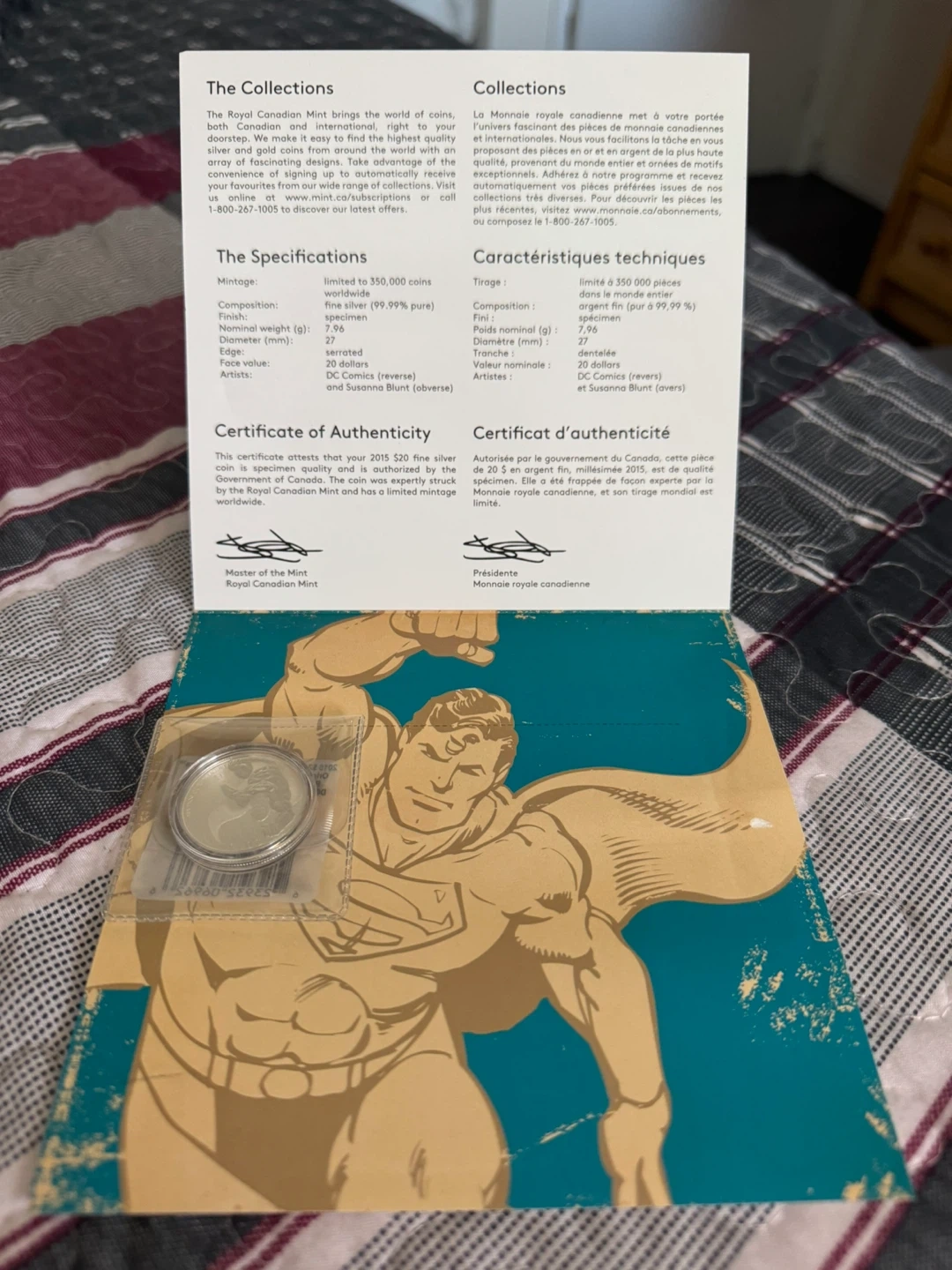 Selling a 2015 Superman $20 fine silver coin. It's in great condition and comes with its original packaging. A great addition for any DC Comics or Superman fan!