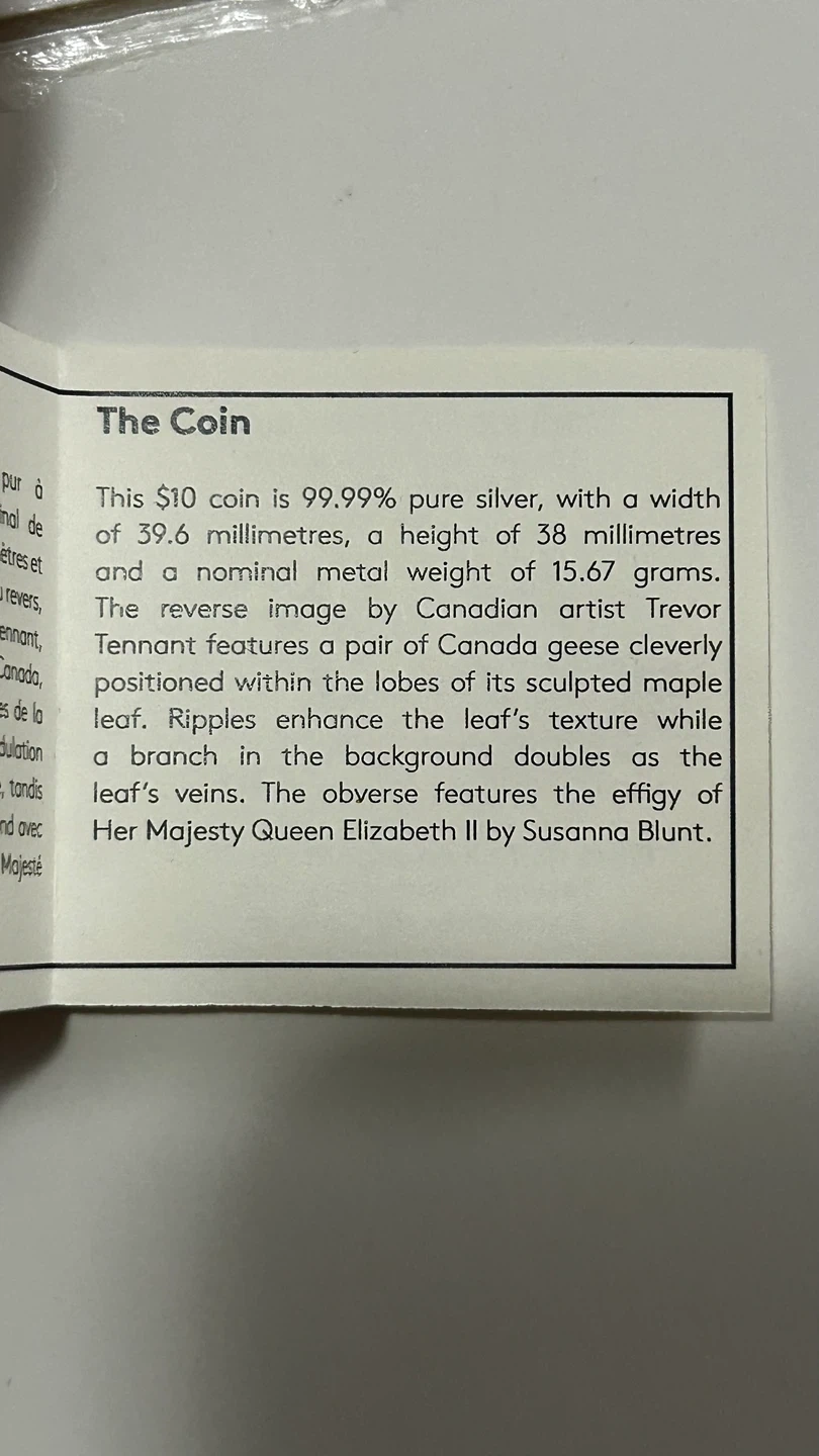 Selling a beautiful 2016 $10 fine silver coin featuring a pair of Canada geese. It's 99.99% pure silver, with a width of 39.6 millimetres and a height of 38 millimetres. The coin has a nominal metal weight of 15.67 grams. The reverse image is by Canadian artist Trevor Tennant. The obverse features the effigy of Her Majesty Queen Elizabeth II.