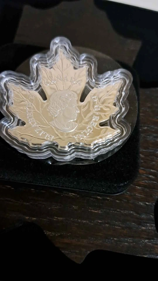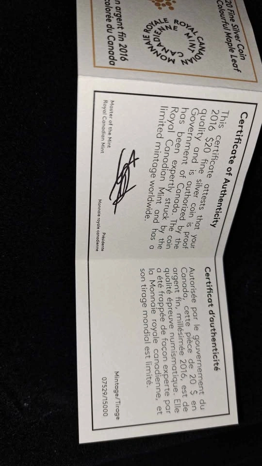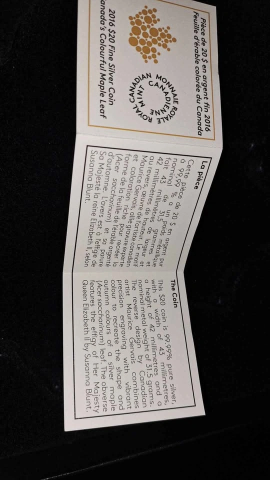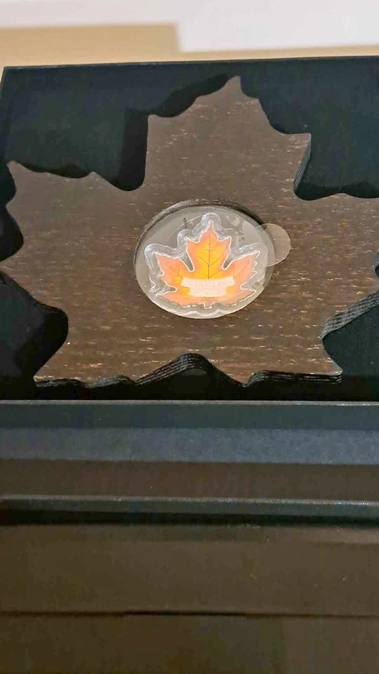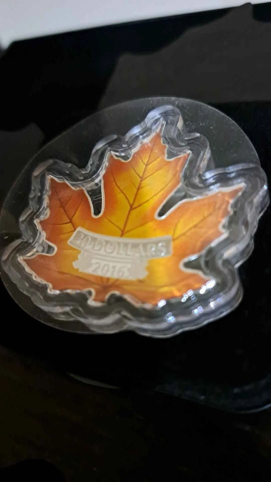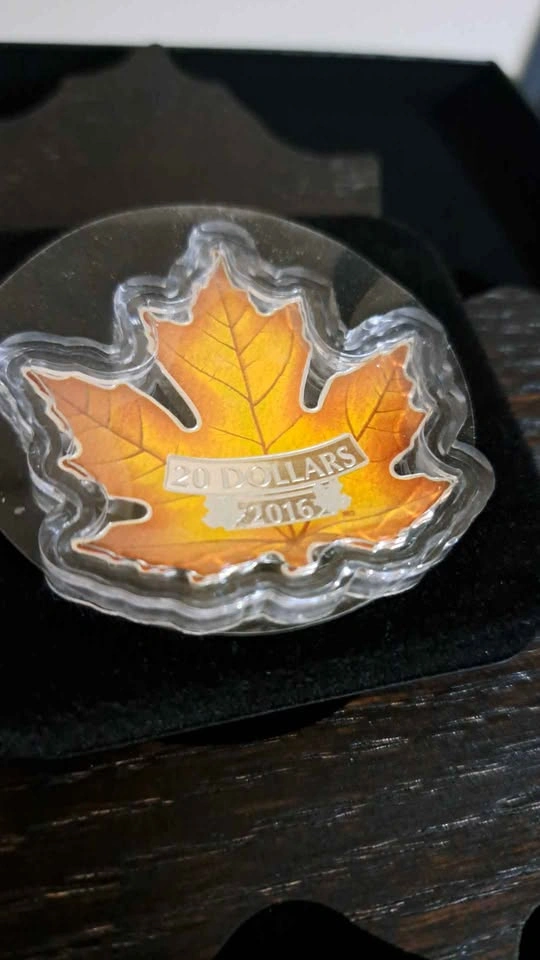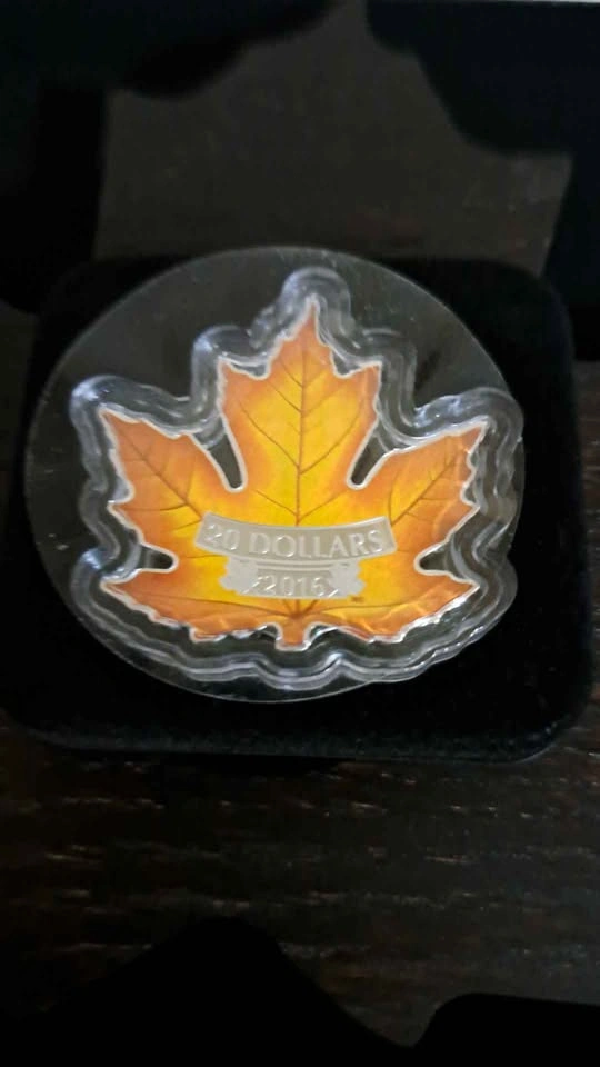 2016 Royal Canadian Mint. Fall color, beautiful Maple Leaf shaped coin. 1 oz pure silver. Comes with full wooden display.