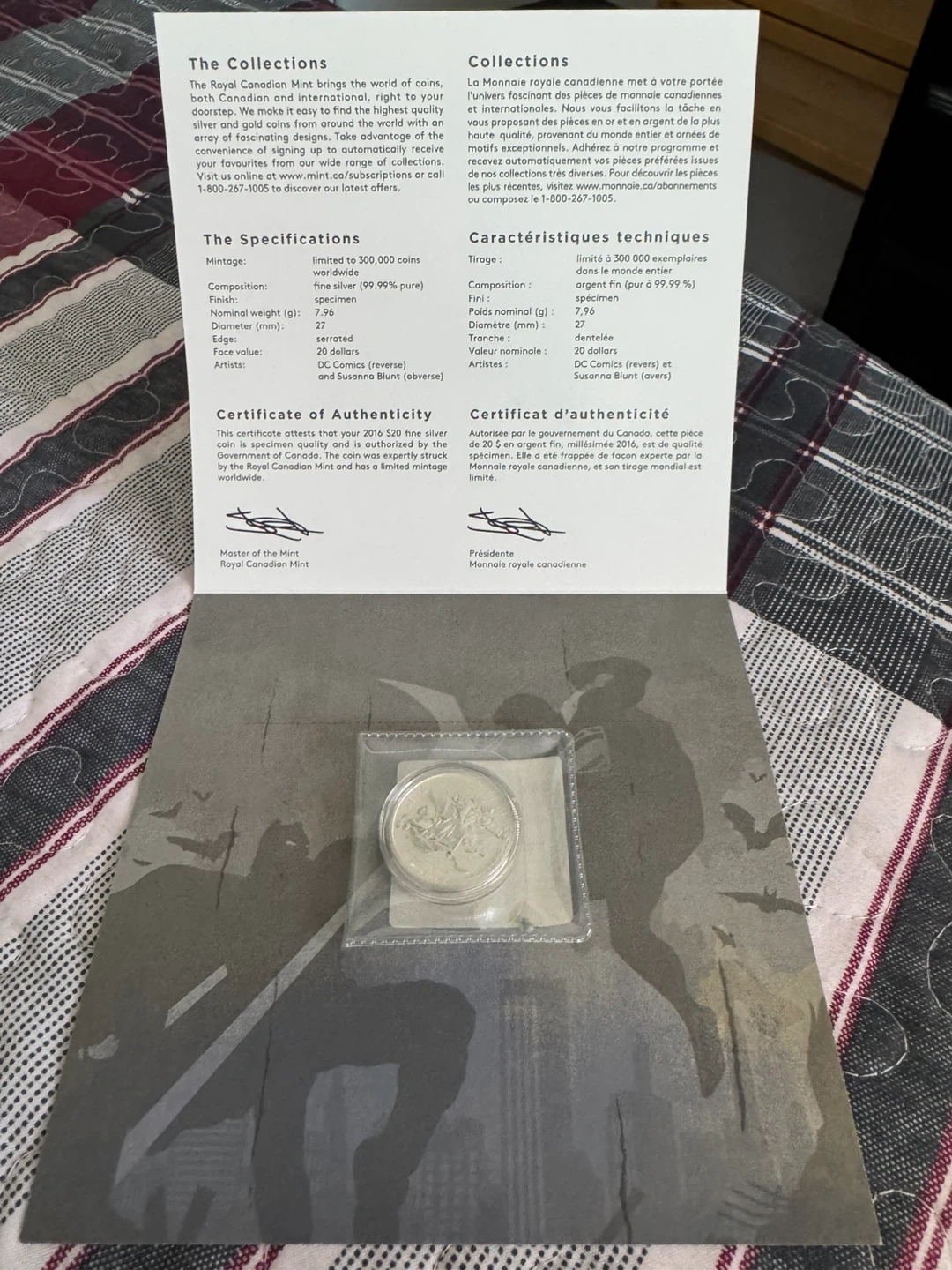 Selling a 2016 fine silver $20 coin featuring Batman vs. Superman. It's a specimen coin with a serrated edge and weighs 27g. The coin is 99.99% pure silver. A certificate of authenticity from the Royal Canadian Mint is included