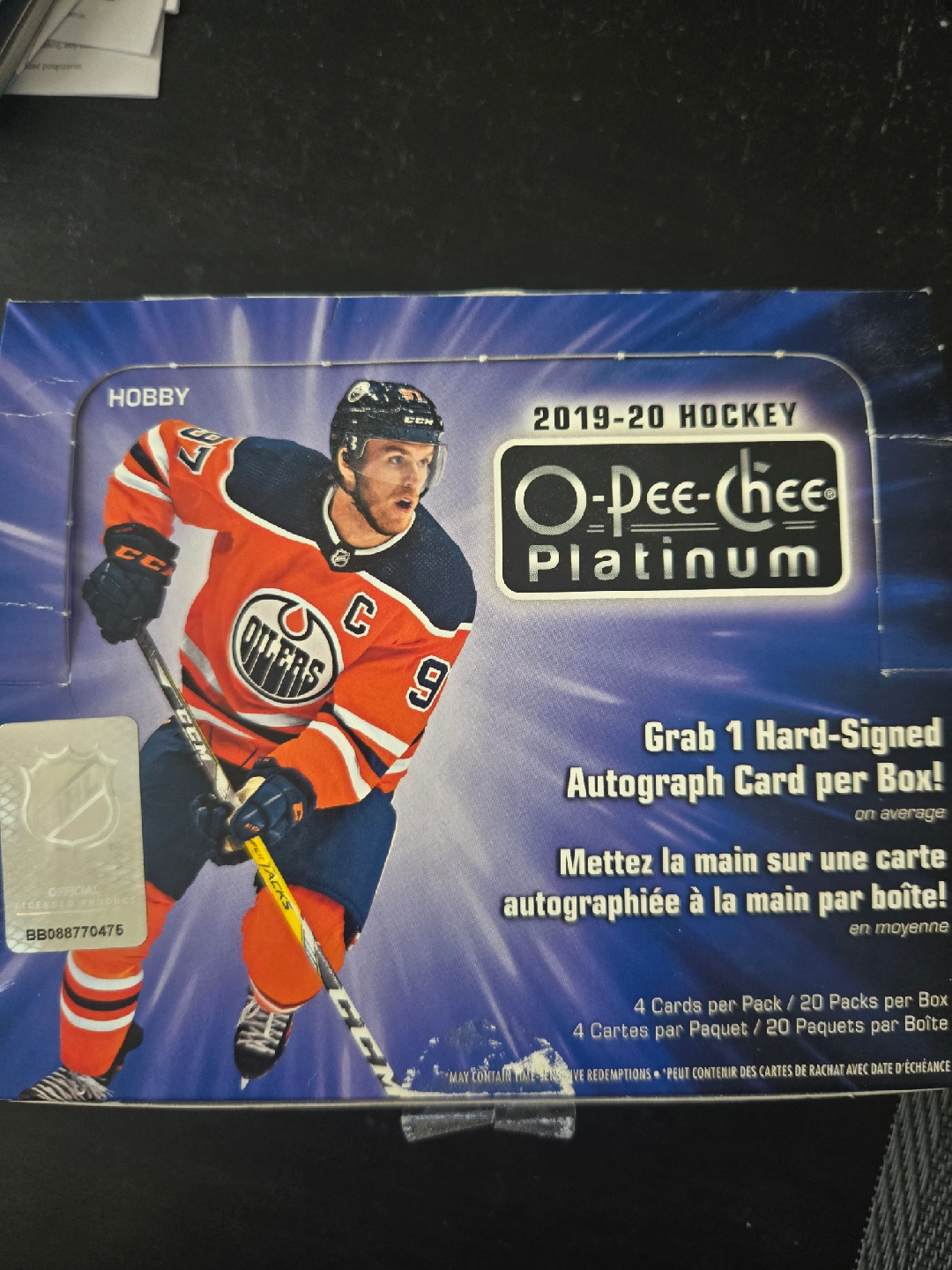 Selling a 2019-20 O-Pee-Chee Platinum Hockey Hobby Box! It includes cards of players such as Connor McDavid, Auston Matthews, Quinn Hughes, and Brock Boeser. Grab 1 Hard-Signed Autograph Card per Box on average!