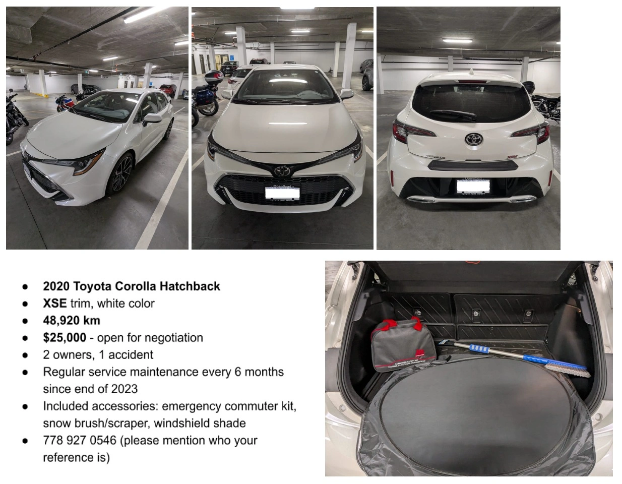 Selling a 2020 Toyota Corolla Hatchback with the XSE trim in a sleek white colour. It has 48,920 km on it. Included accessories: emergency commuter kit, snow brush/scraper, and windshield shade