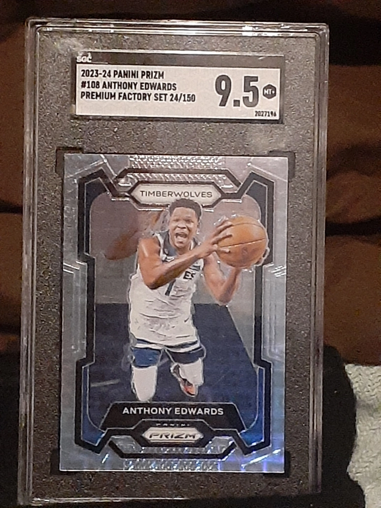 Selling a 2023-24 Panini Prizm basketball card featuring Anthony Edwards, card number 108. It has been graded 9.5 by SGC. This is a premium factory set, numbered 24 out of 150