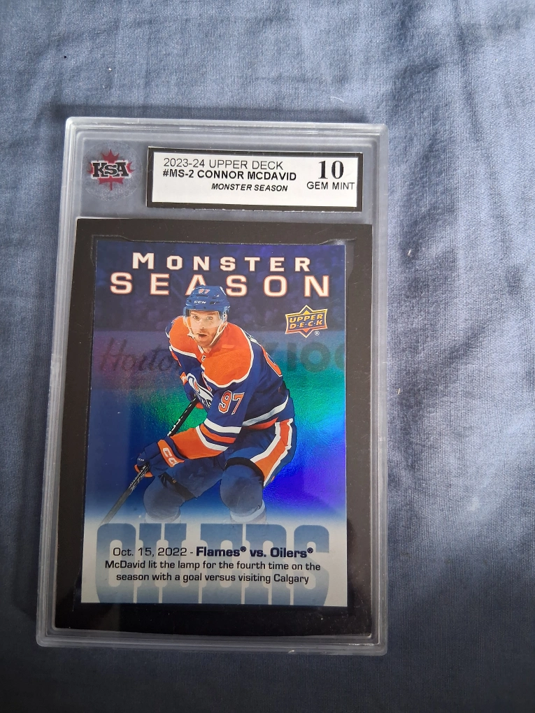 Selling a 2023-24 Upper Deck Connor McDavid #MS-2 Monster Season hockey card. It's graded KSA 10 GEM MINT. A great addition to any hockey card collection!