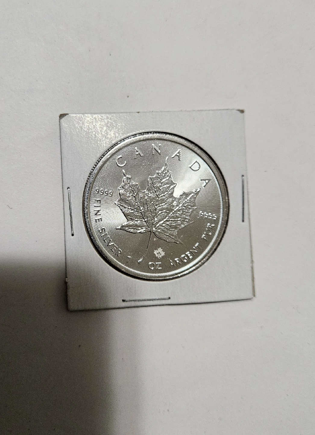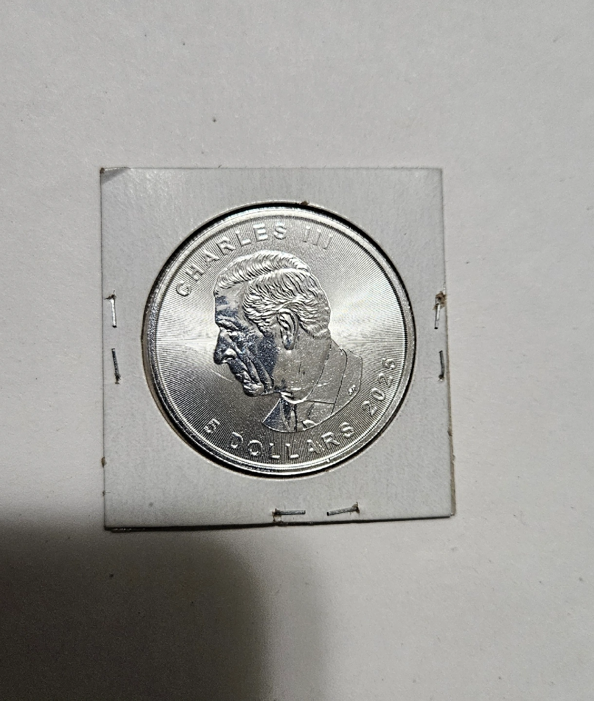 Selling a 2023 Canadian Silver Maple Leaf coin. It's in great condition and features a beautiful maple leaf design on one side and King Charles III on the other. A great addition to any collection!