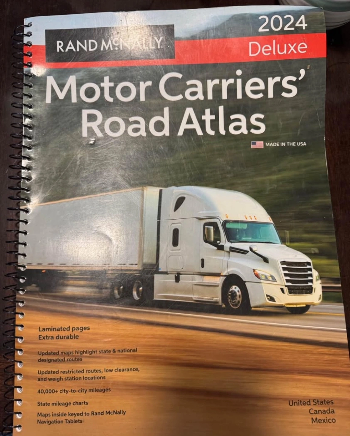 Laminated pages. Extra durable. Updated maps highlight state and national designated routes. Updated restricted routes, low clearance, and weigh station locations. 40,000+ city-to-city mileages. State mileage charts. Maps inside keyed to Rand McNally Navigation Tablets. Covers United States, Canada, and Mexico. $50 or will trade for hiking gear.