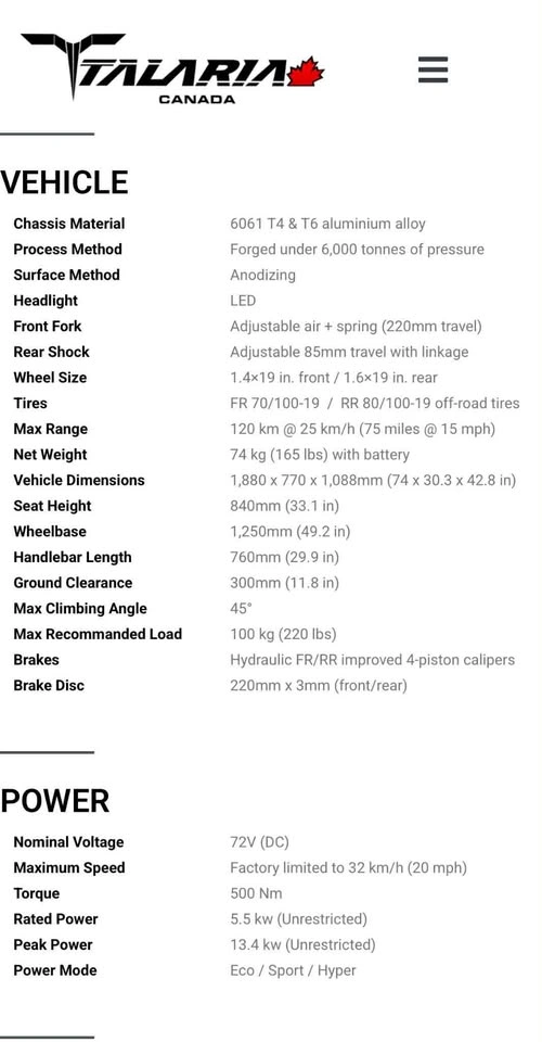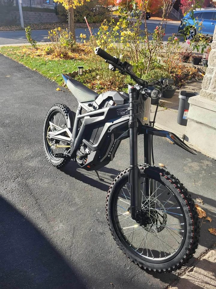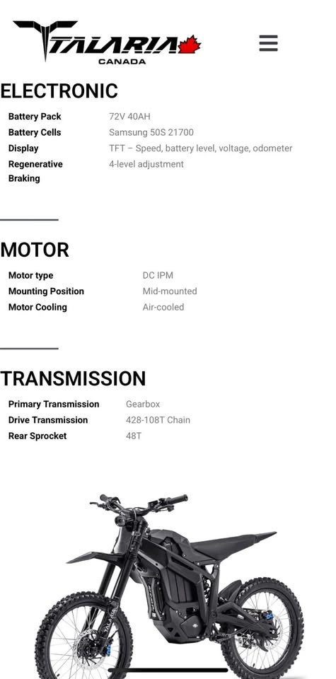 Talaria created the Sting to bring cutting-edge electric performance to all riders. The MX5 is a high-end bike in the light electric motorcycle category. The most powerful Talaria to date, the MX5 features a new 72V/40Ah battery, separating it from the majority of the competition. The MX5 features a lightweight frame, powerful mid-mounted IPM motor, 72V/40Ah battery and 120 km (78 mile) max range. Feel instant torque through the Sting’s intelligent gearbox and extremely quiet drivetrain. Power and battery: The Sting MX5 Pro uses a 72V/40Ah lithium-ion battery with Samsung 50S 21700 cells, delivering 2,880 watt-hours of energy. This results in a 45% power increase over 60V Talaria models, with a peak output of 13.4 kW. Performance modes: It features three riding modes: Eco, Sport, and a high-performance "Hyper" mode unique to the MX5. Top speed: The bike has an unrestricted top speed of about 98 km/h (61 mph). Range: The estimated maximum range is up to 120 km (75 miles) when riding at 25 km/h (15 mph). Gearbox vs. belt: Unlike some competitors that use a belt drive, the MX5 has a durable, quiet gearbox. This eliminates the need to replace snapped belts. Regenerative braking: The bike includes a regenerative braking system with four adjustable levels, which can be controlled via the throttle. Suspension: The MX5 features an adjustable air and spring suspension system that offers better off-road performance than the MX4 model. Brakes: The braking system is significantly upgraded with larger 220mm x 3mm disc brakes, bigger calipers, and a redesigned master cylinder for improved stopping power and heat dissipation. Frame: The chassis is made from 6061 T4 & T6 aluminum alloy, forged under high pressure for increased durability. Display: A color TFT display shows real-time speed, battery level, voltage, and odometer readings. Further highlights include headlight on/off switch, removable battery and battery cover, a compact, well-balanced light-weight chassis and overall very low maintenance. Break in oil change already completed. Brown wire is already unrestricted so it will go 98km/hr on sport mode. Other than that completely stock. Son just doesn't seem to use it much so we will sell and maybe get him a drum set instead.