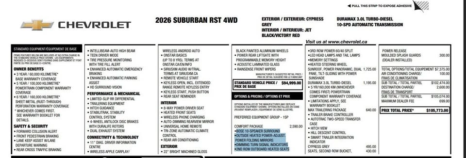 2026 Chevrolet Suburban RST 4WD Turbocharged Diesel I6 3.0L Colour -Cypress Grey Int: Jet Black Seat, 2nd row Bucket, power release Panoramic Roof Max Trailering Package Comfort Package windows sticker in Photos for all the options Call/text Darian King, the Calgary Car King at 4️⃣0️⃣3️⃣4️⃣0️⃣1️⃣1️⃣8️⃣7️⃣0️⃣ for more info. 📍 Amvic licensed dealer 🏁 Shaganappi GM Calgary Rates as low as 0% on select vehicles. Employee Pricing on select vehicles! Get approved today, good credit or rough credit accepted! Now Accepting New to Canada, Bankruptcy/Proposal, and Self Employed Applicants! I have special banks and programs to help you get approved!