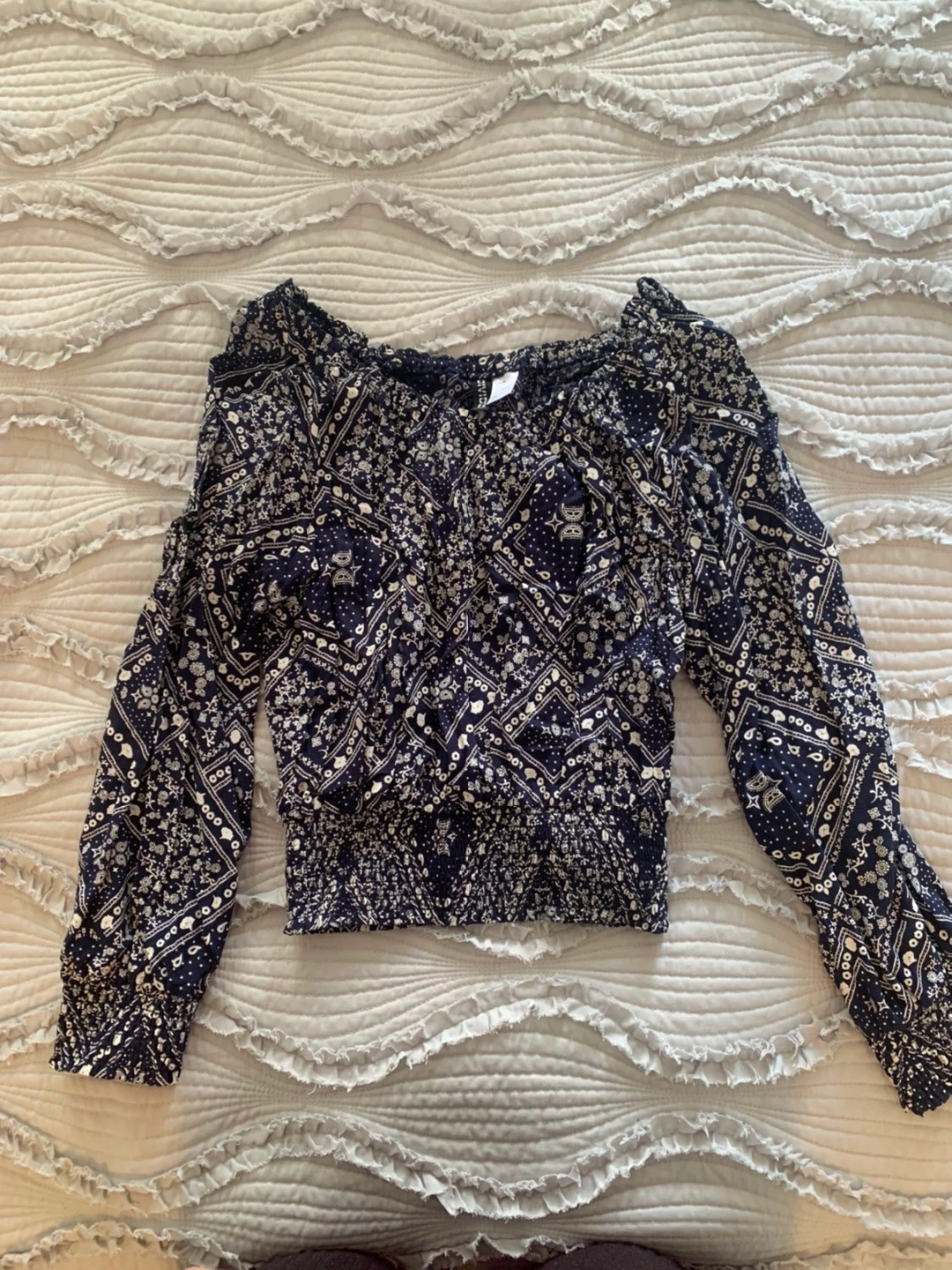 Brand new never been worn! Off shoulder with elastic around neckline, cuffs and waist. Bandana style pattern. Navy blue and white. Smoke and pet free home Decluttering, need a new home for use!