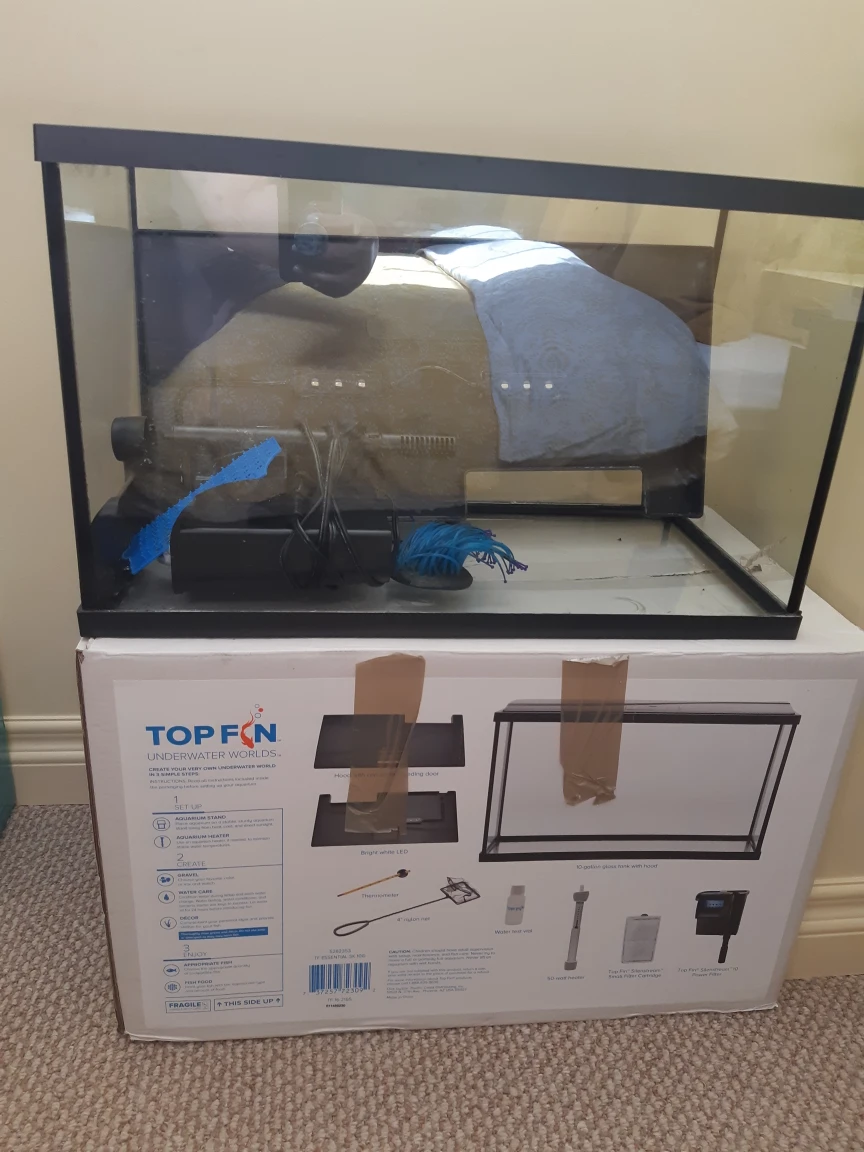 Selling my aquarium that is 10 gallon perfect of beta fish, tetras, and guppies. A cheaper alternative to buying new one, comes with blue stones (roughly retails for $20) and artificial glow in the dark blue/purple anemone ornament. Also, could be used as a seperate hospital tank.
