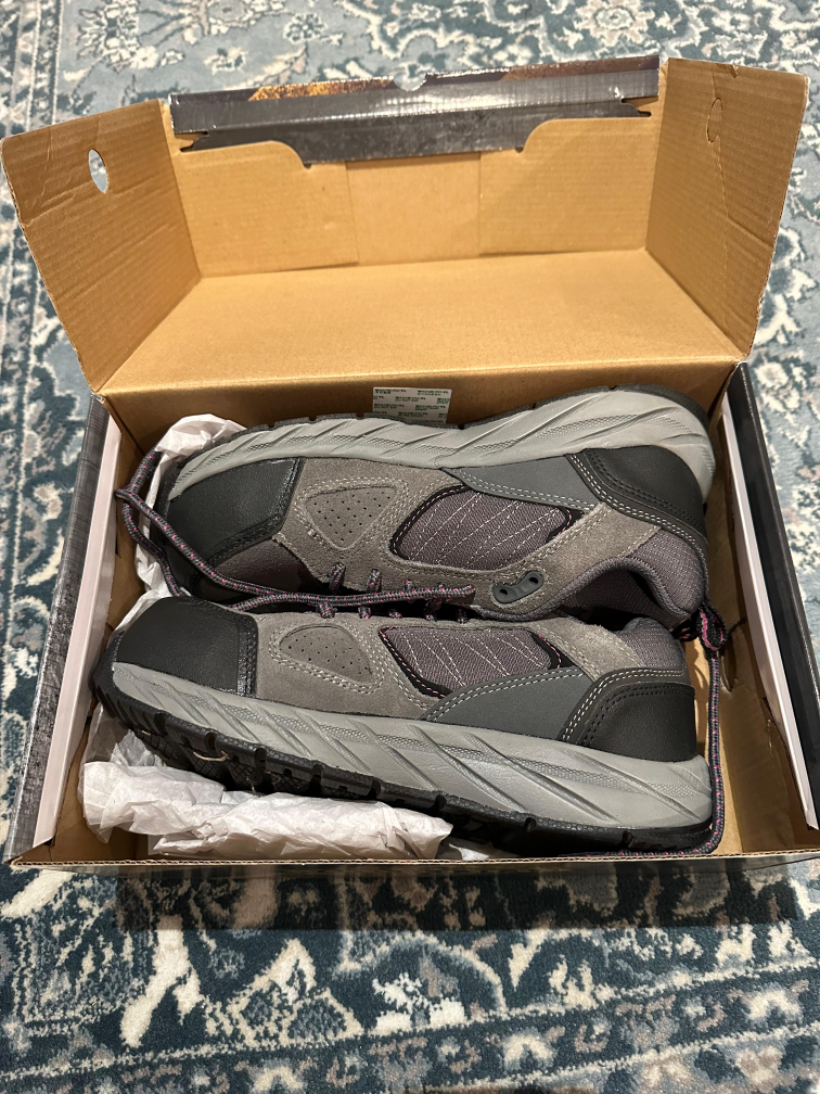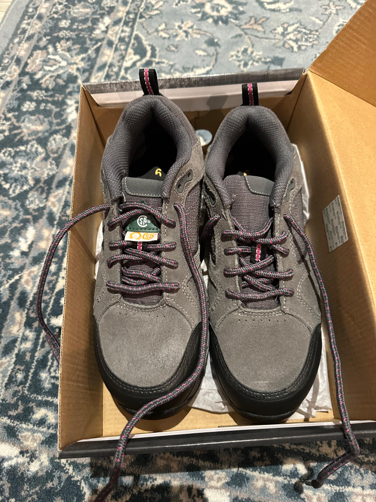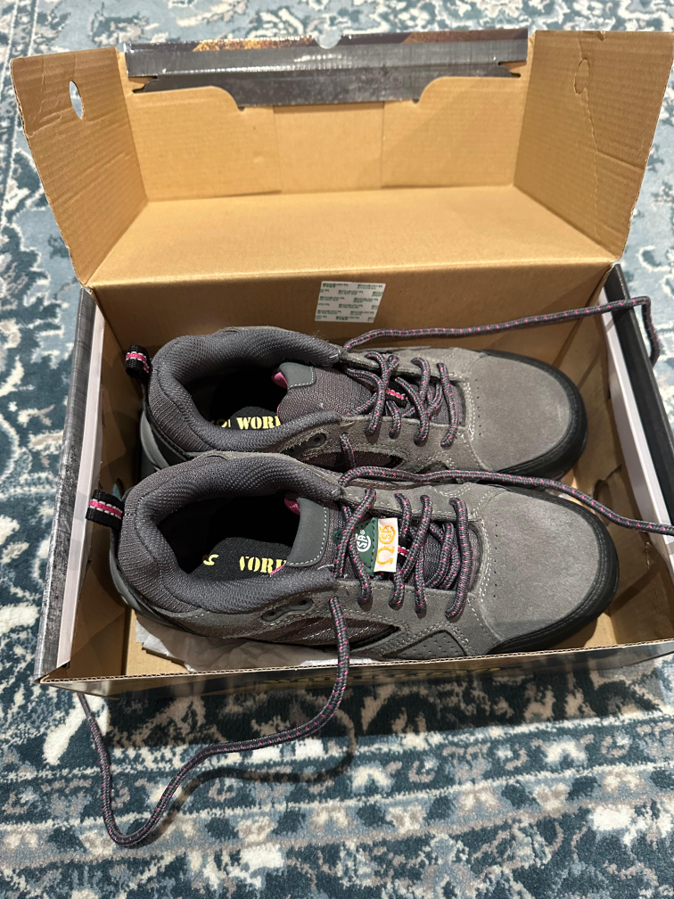 Wore only once or twice with no wear and tear, freshly like new. ‼️CSA Approved with Green Tag‼️ ‼️Size - 6 Ladies/Dames‼️ •Suede and mesh upper • EVA and rubber outsole • Round toe • Lace-up closure • Back pull tab This pair features keep your feet comfortable and protected in the durable style. Made with a suede and mesh upper, they're styled with a round toe and a lace-up closure. Pickups Only Cash/Electronic Payments accepted.