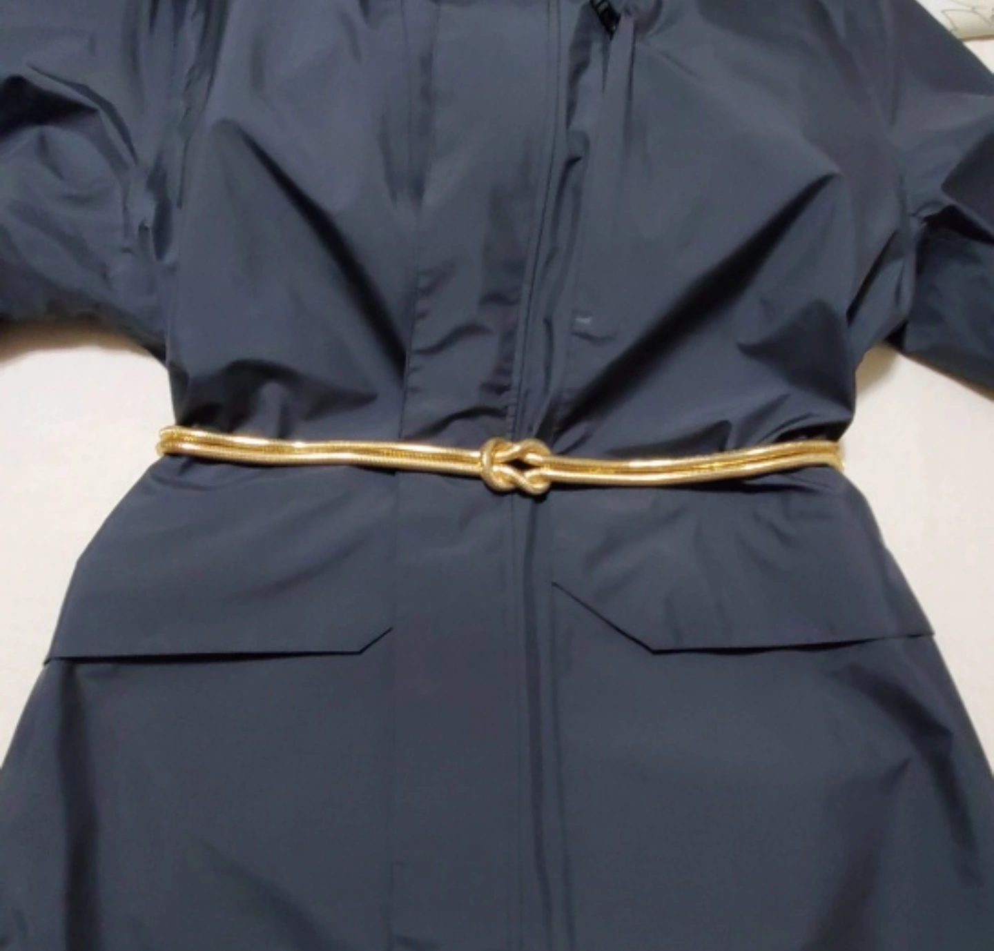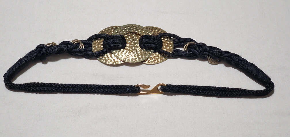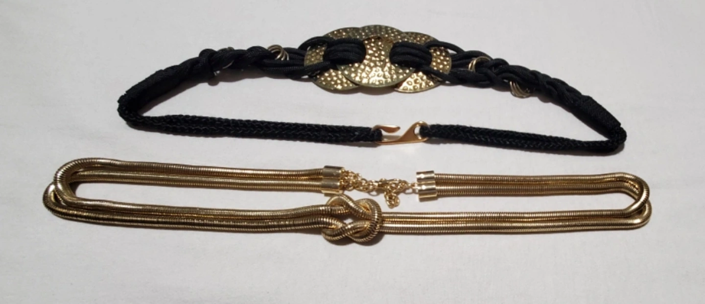 1. Gold tone slinky knot double strand 36" w/ the extender of 4" 2. Made in taiwan. Hammered gold tone discs with black rope.