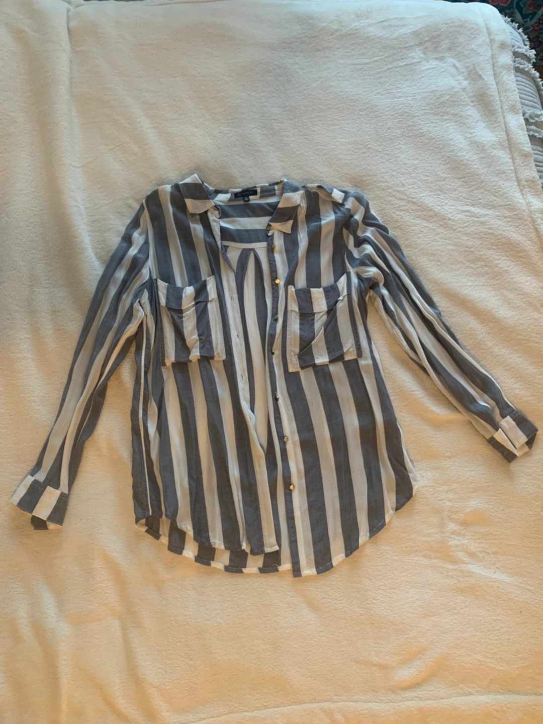 Thin, grey and white striped button up. Good condition. Smoke and pet free home Please check all my listings for lots of Free items and discounted purchases to come! Everything must go!
