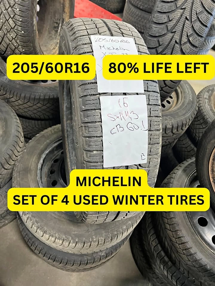 205/60R16 Michelin X-ICE3 SET OF 4 USED WINTER TIRES 80% LIFE LEFT. Please Note: Some photos may show tires mounted on rims — rims are not included. Pricing includes installation and balancing. HST is added at checkout. We also stock a wide selection of new and used alloy and steel wheels. To ensure a perfect fit for your vehicle, please provide your make, model, and year, and we’ll offer you a range of options tailored to your budget. FREE Installation & Balancing on all new and used tires NO Disposal Fees 30-Day Satisfaction Warranty on all used tires Thousands of Tires In-Stock – all brands, all sizes Same-Day Appointments available Full Auto Services on-site Tire Changeover Special – Included FREE with Service: Tire inspection Inflation adjustment TPMS relearn Tire bags OEM-spec re-torque On-Rim Changeover: From $60 Off-Rim Changeover: From $120 Tire Repair: $40 Wheel Lock Removal: From $20 Tire Storage (6 Months): $120 Complete Auto Repair & Maintenance From brakes, oil changes, diagnostics, and alignments to suspension and engine services, our certified 310S technicians handle it all — using state-of-the-art equipment and professional care.