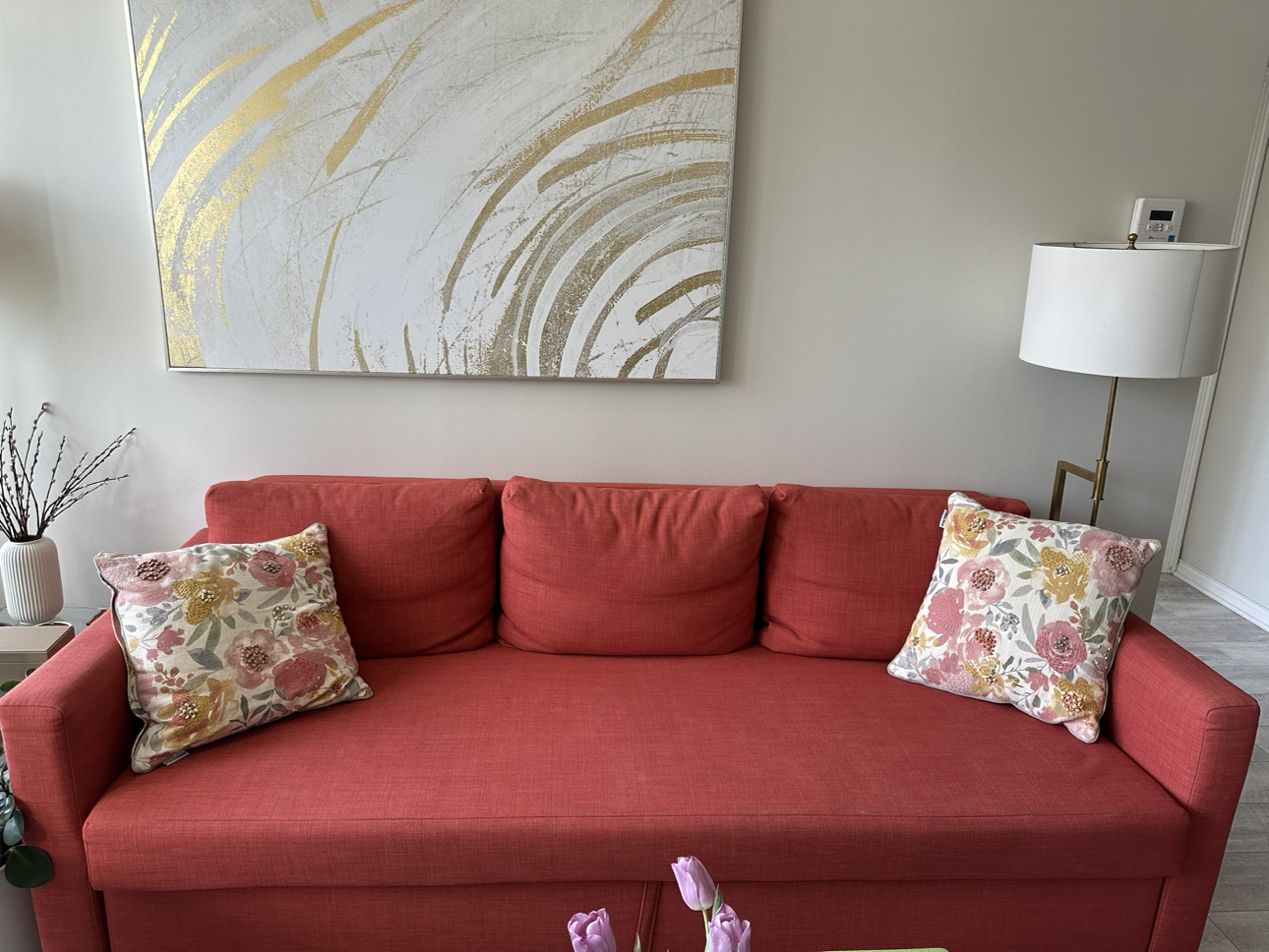 IKEA FRIHETEN Sofa Bed – Sleek, Functional & Vibrant Orange! Brighten up your space with this stylish IKEA FRIHETEN sofa bed in a bold orange hue – the perfect mix of modern design and everyday practicality. • Transforms easily from a comfy sofa to a spacious bed • Built-in storage for bedding, pillows, or anything you need to tuck away • Comes with two floral throw pillows for an extra pop of charm • Gently used and in good condition • From a smoke-free, pet-free home Perfect for condos, apartments, or guest rooms – it’s a space-saver that doesn’t compromise on style. Ready for pickup – message if interested! Width: 225 cm (88 5/8 ") Depth: 105 cm (41 3/8 ") Height: 83 cm (32 5/8 ") Seat depth: 61 cm (24 ") Seat height: 46 cm (18 1/8 ") Bed width: 144 cm (56 3/4 ") Bed length: 199 cm (78 3/8 ")