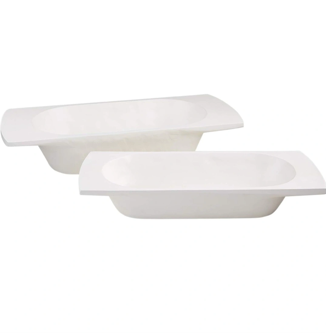 BRAND NEW NEVER USED, rustic. Retails for $175 The Rustic style of this huge, gorgeous white wood bowl is handcrafted from mango wood with natural wood cracks and dents to add to its rustic appeal. These are not defects. See pictures. The painted white brings a coastal vibe anywhere you place it. Perfect to display some of your Christmas decorations. NOTE: Flowers and decor in pictures are not included. LISTING PRICE INCLUDES: one 24" Large white rectangular dough bowl (It's the larger bowl in the picture of 2) Smaller bowl is also available for sale at an additional price. Small bowl is used but in perfect condition. Please ask if interested. Size: X large 24"L x 10"W x 5"H Material: Mango Wood Brand: Mud Pie Colour: White Care Instructions: HAND WASH ONLY DO NOT SOAK DRY IMMEDIATELY