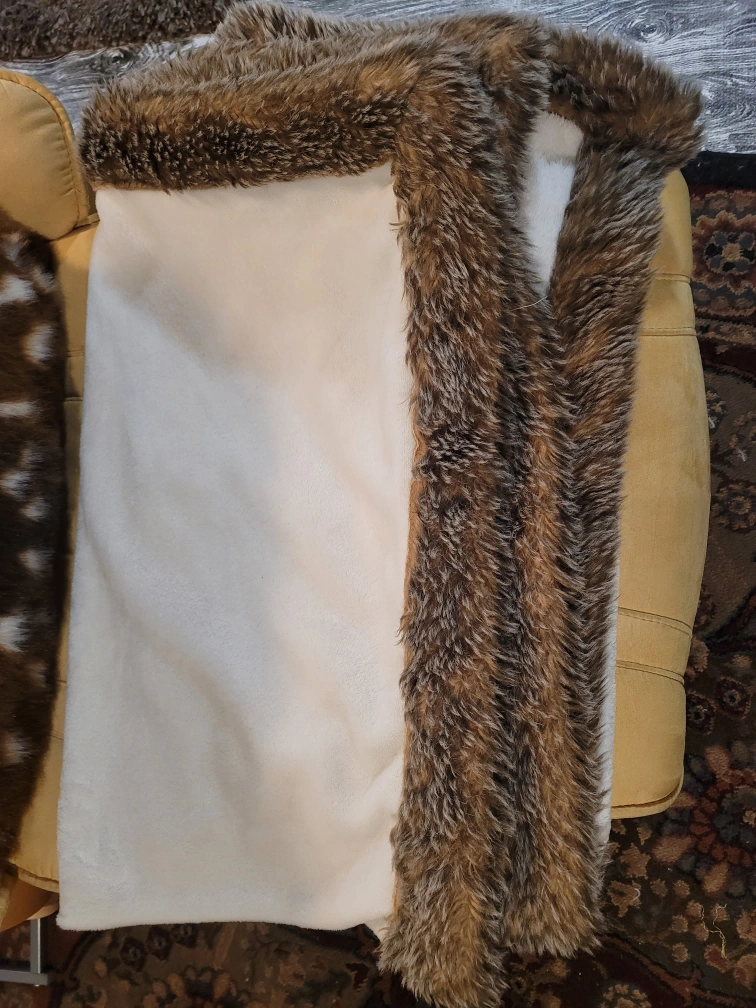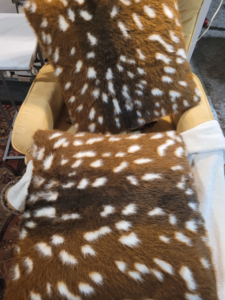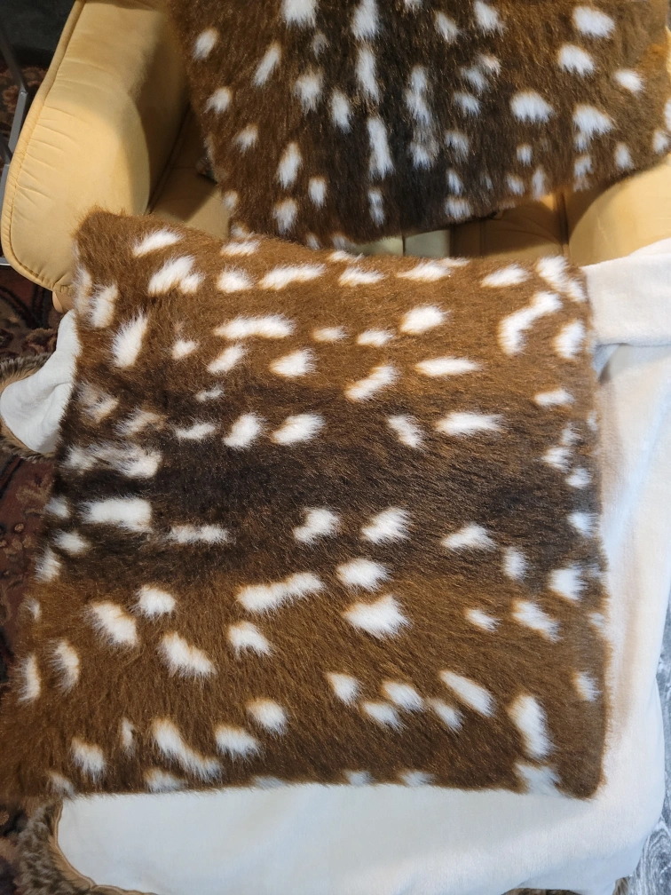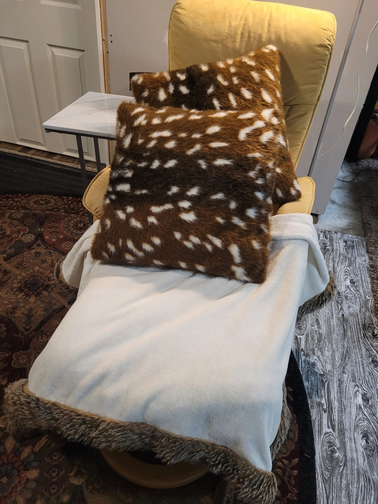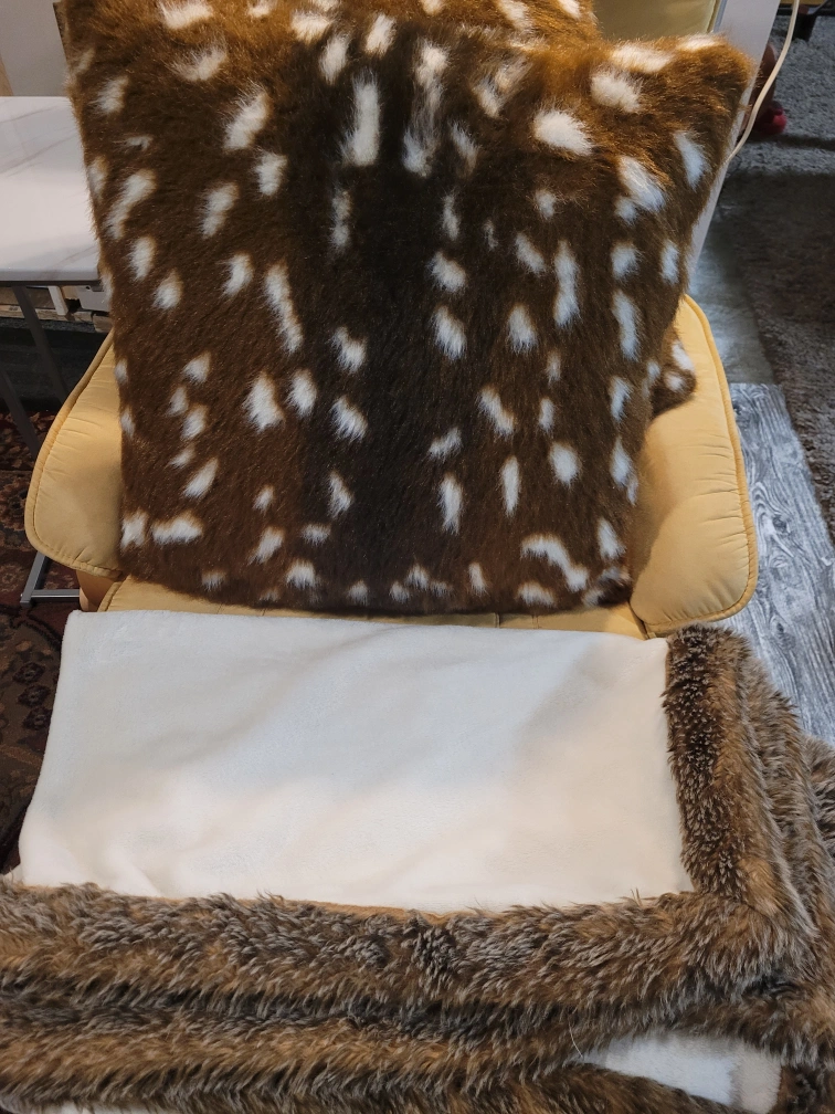 Beautiful faux deer fur pillows with cream colour fleece and faux fur blanket. Blanket measures 53x46 Pillows measure 20x20 each Pick up in Westwood or delivery for an extra fee