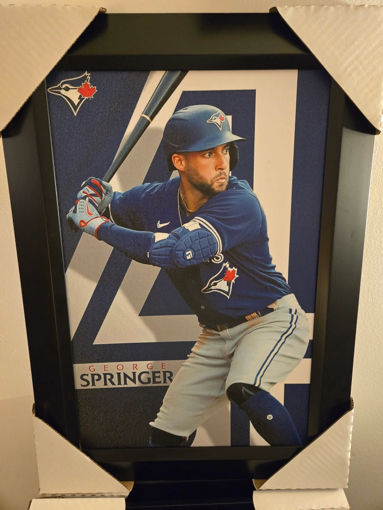 Selling a collection of framed posters featuring Toronto Blue Jays players George Springer and Bo Bichette, as well as Toronto Maple Leafs players. Great for any sports fan! $40 each