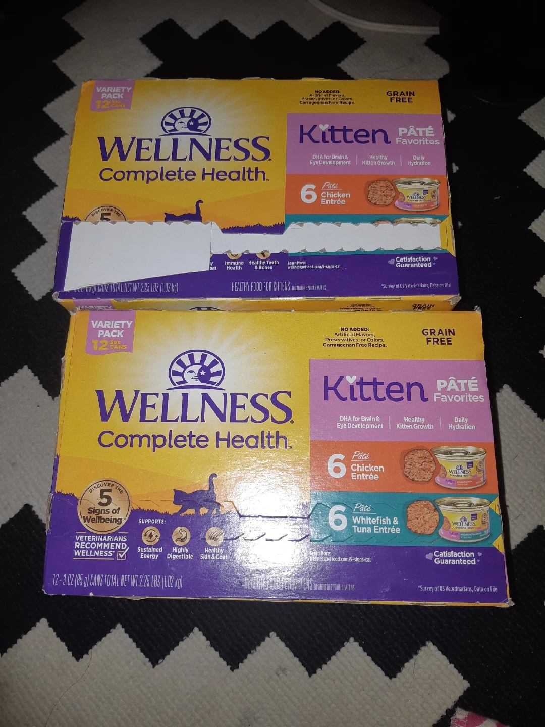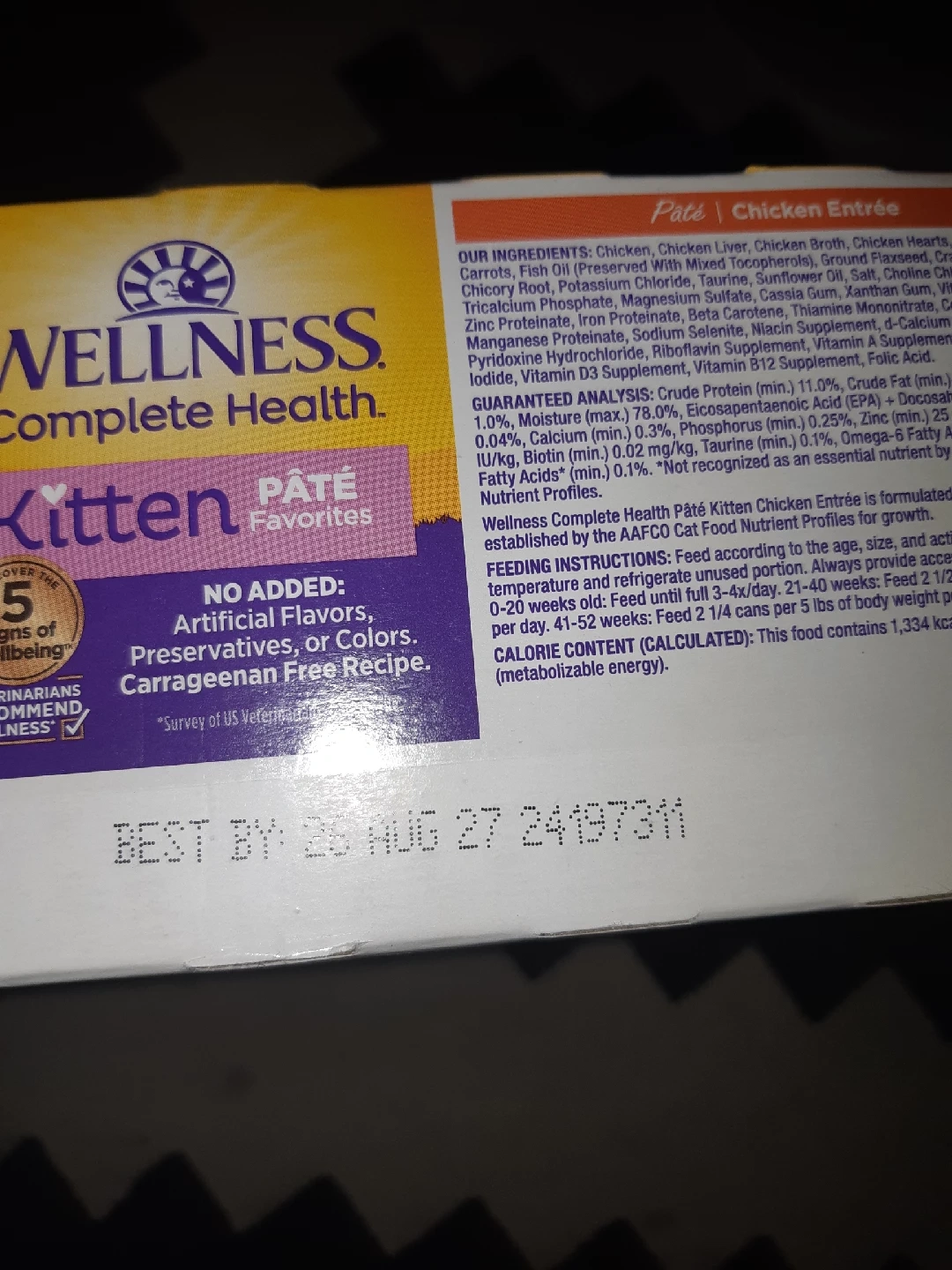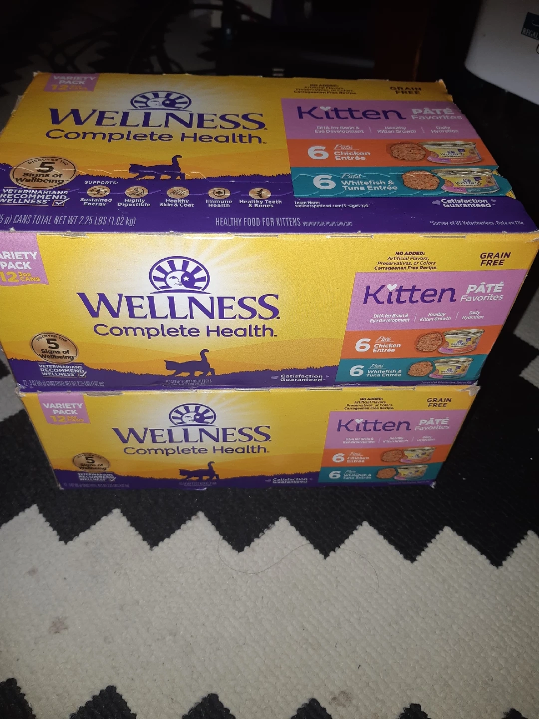 Wellness Complete Health Kitten Pate Variety Pack, grain-free and perfect for your little one! It supports healthy digestion, skin, teeth, and immune system. Includes chicken and whitefish & tuna entrees. Best before 2027 August 26