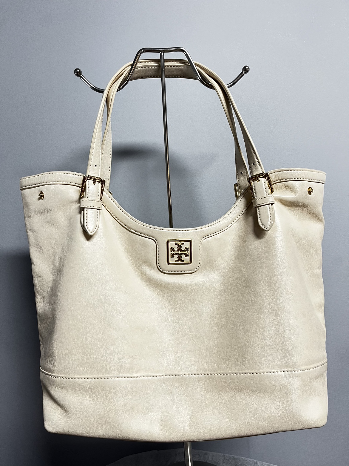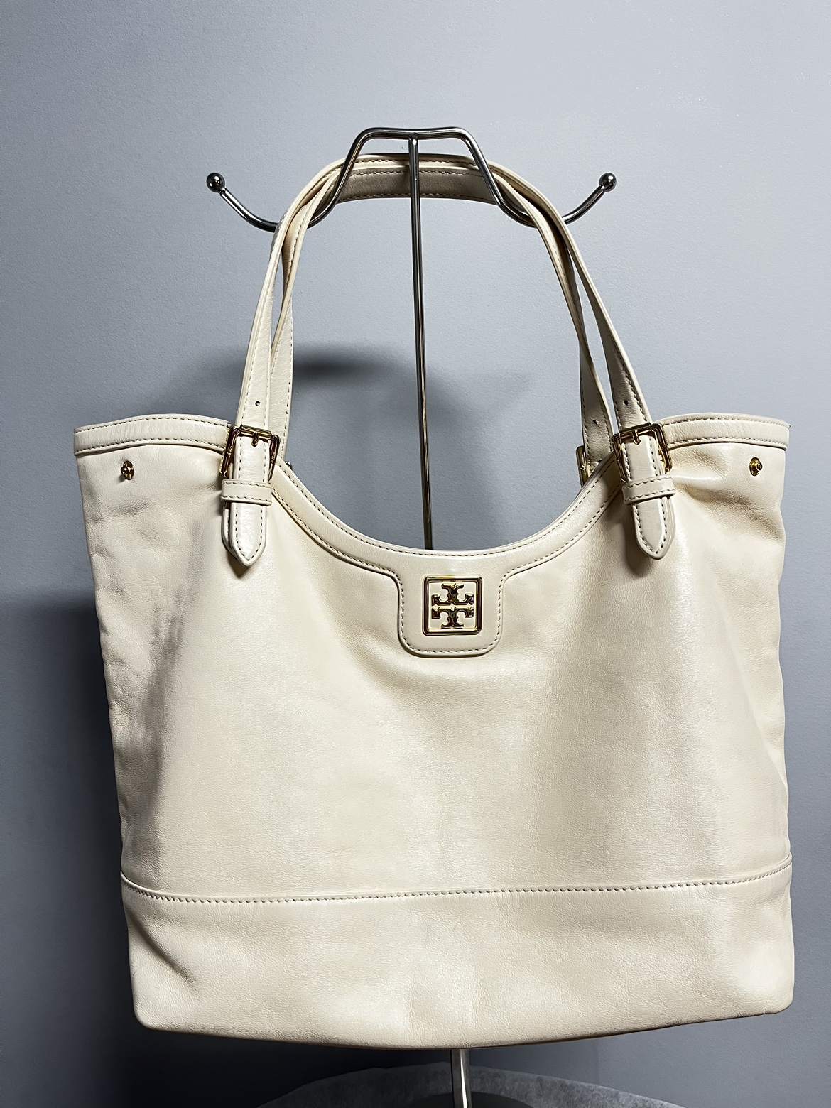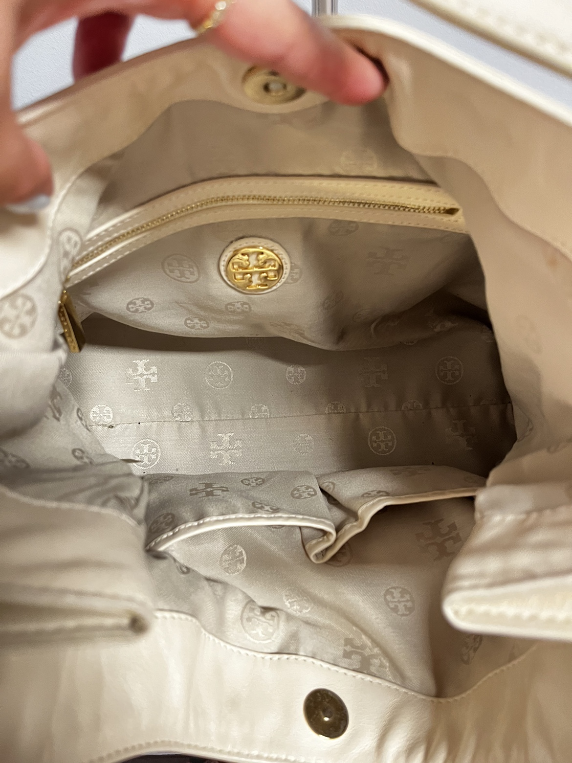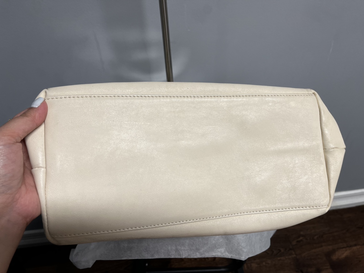 Tory Burch Leather shoulder bag - Cream - leather - interior is clean - it has some not that visible dirt when you look closely. Rubs on sides. - expandable - very spacious Length: 12” Width: 6” Height: 12” Handle Drop: 10”