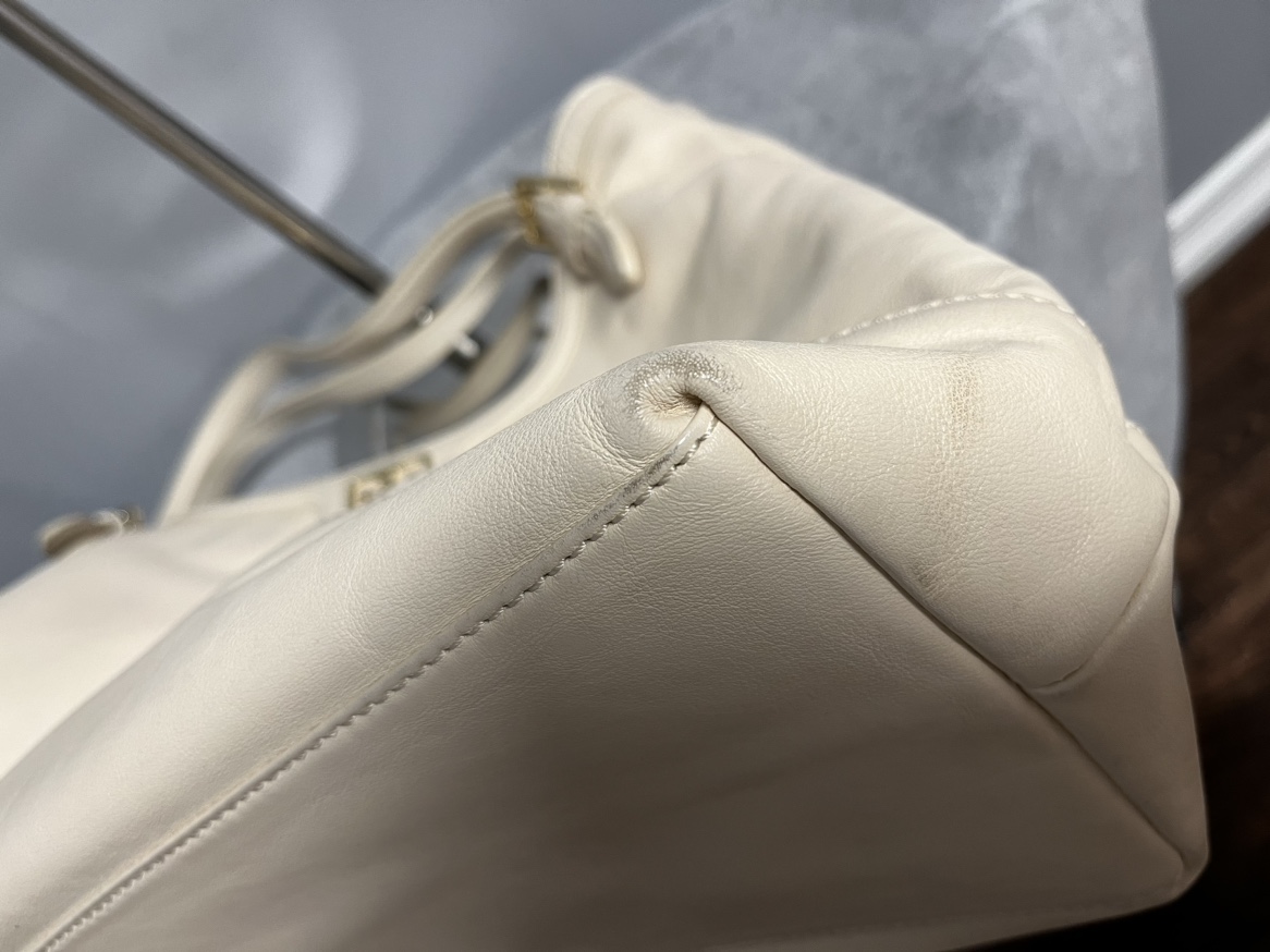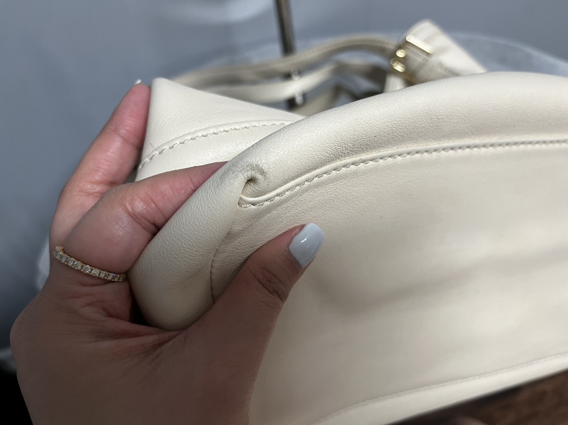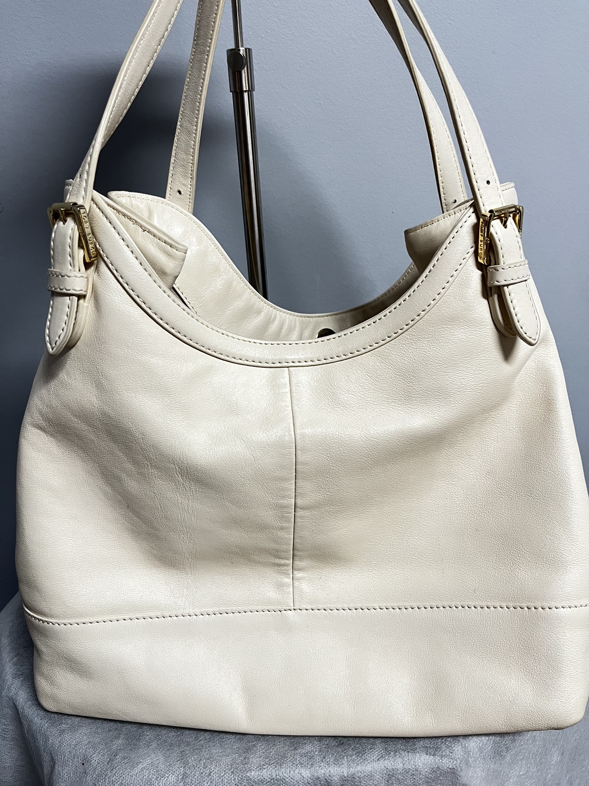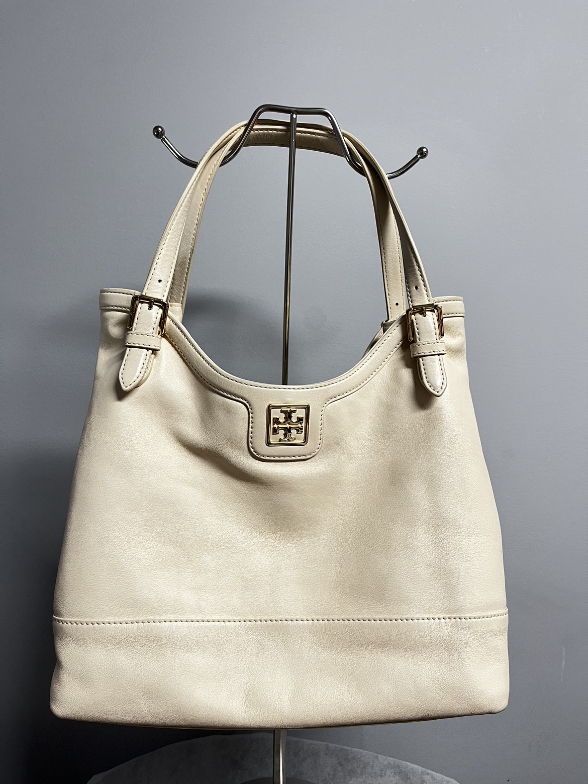 Tory Burch Leather shoulder bag - Cream - leather - interior is clean - it has some not that visible dirt when you look closely. Rubs on sides. - expandable - very spacious Length: 12” Width: 6” Height: 12” Handle Drop: 10”