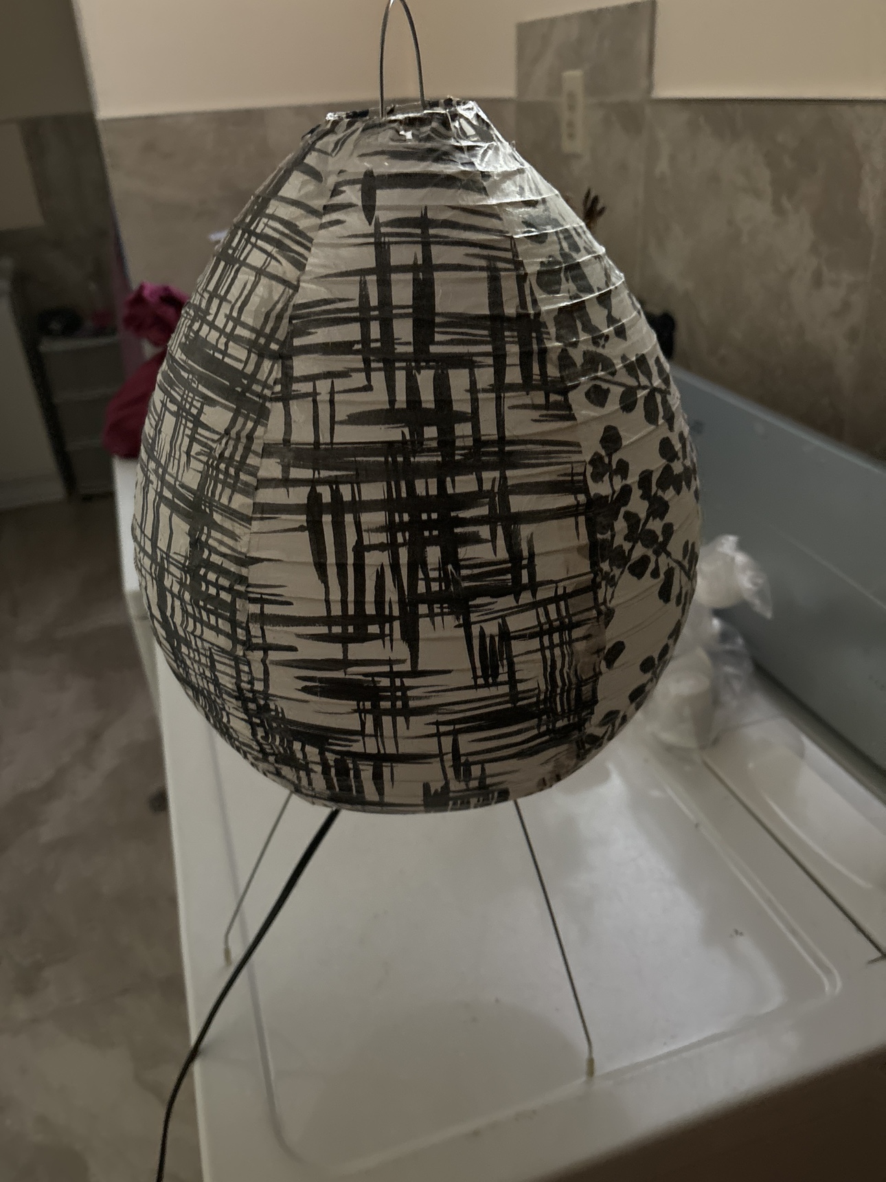 I think it’s an IKEA lamp comes with bulb. It’s got a tiny tear here and there, but honestly, you can’t even see it.