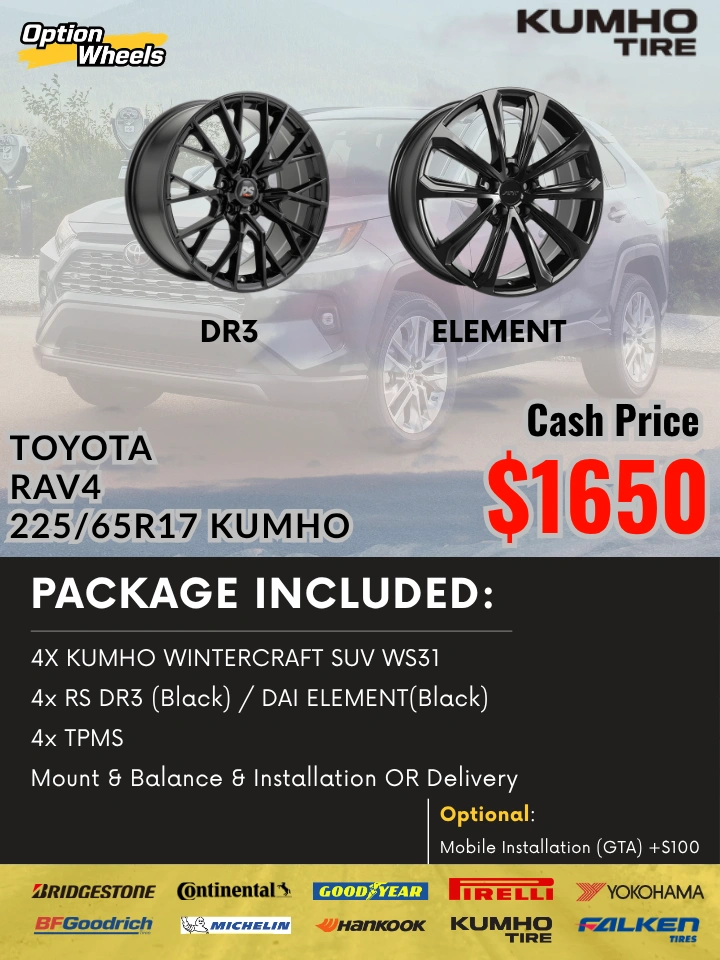 Get your RAV4 ready for Canadian winters with this complete set – designed for safety, style, and peace of mind. Package Includes: ✔️ 4x Kumho Wintercraft SUV WS31 Tires (225/65R17) ✔️ 4x Wheels – choice of RS DR3 (Black) or DAI Element (Black) ✔️ 4x TPMS ✔️ Mount & Balance ✔️ Installation OR Delivery included 💰 Cash Price: $1650 Optional Service: 🚚 Mobile Installation in GTA: +$100 📍 Option Wheels – Oakville, ON 📲 Message us today to confirm fitment and lock in your winter package!