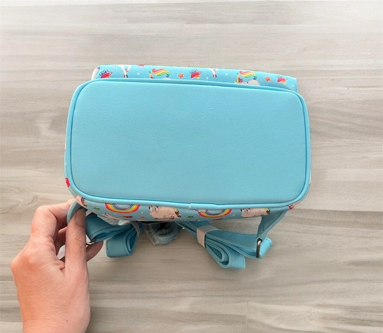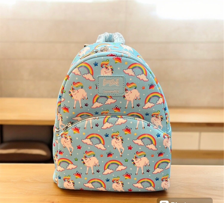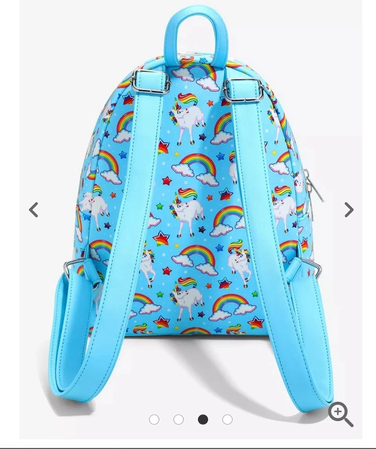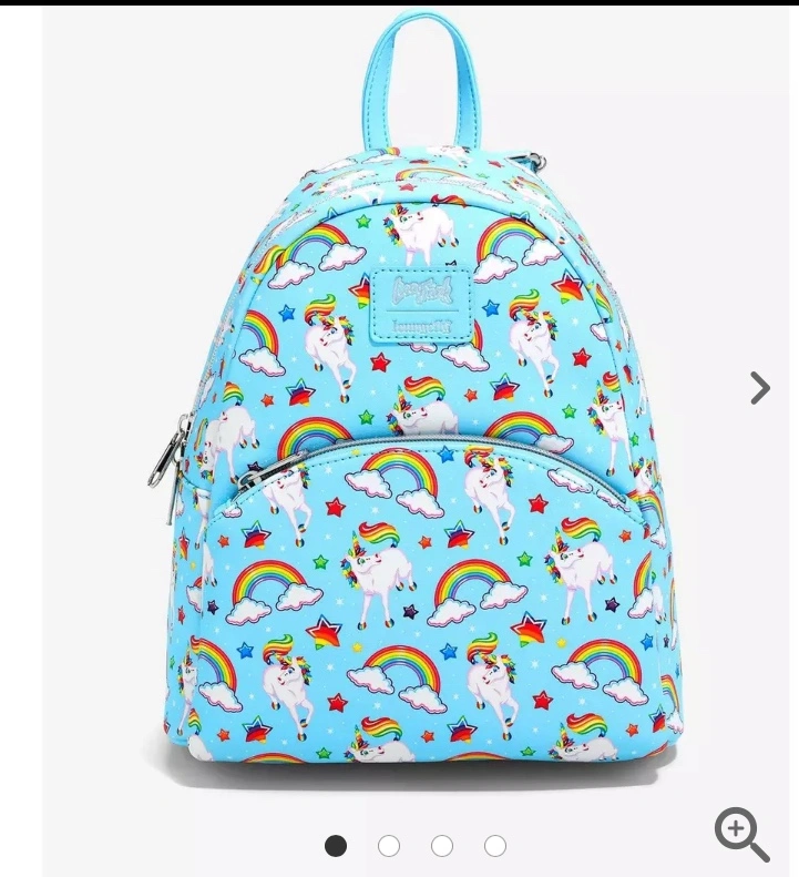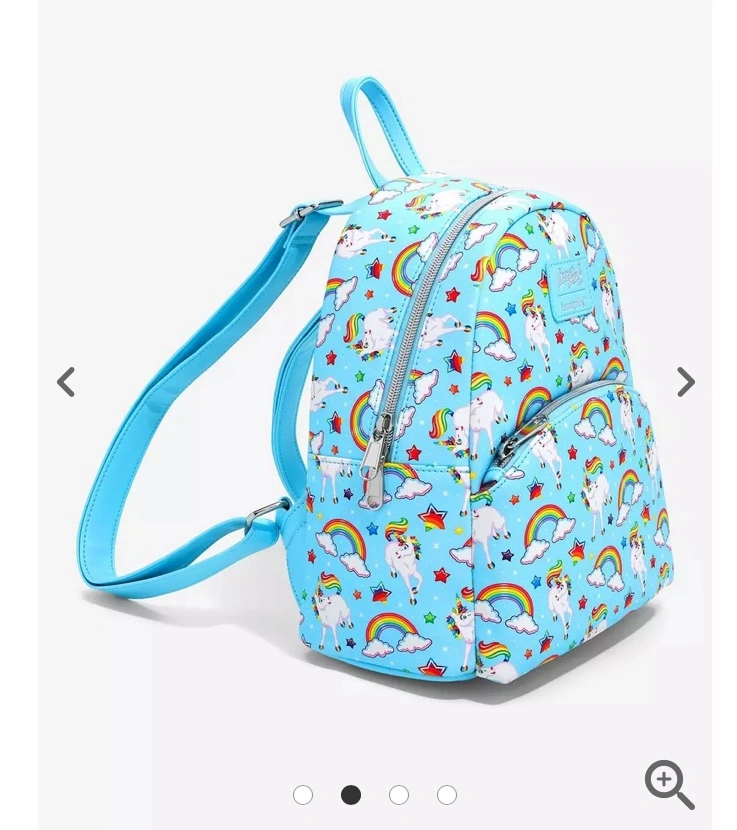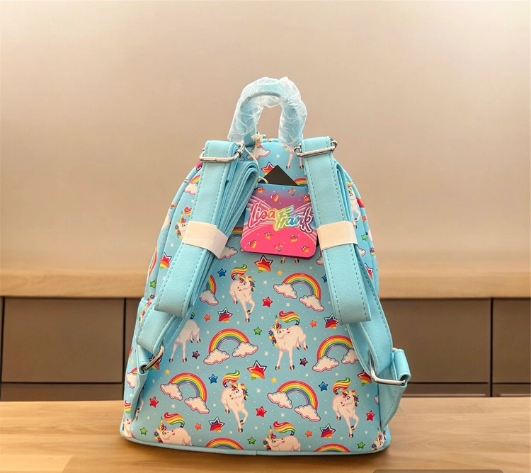 NWT Loungefly Lisa Frank Markie Unicorn all over print mini backpack. Markie has rainbow horn, tail, mane & hooves and there are also rainbows and clouds, stars and shooting stars covering the backpack as well. All of this on a beautiful baby blue backpack with silvre zipper and accessories. This is perfect for celebrating PRIDE month! The inside of the bag is a bright pink lining with a small zippered pocket in the front in addition to the main storage pouch. Within the main pouch is another small pocket (see pictures). Markie the unicorn is one of the most iconic Lisa Frank characters. So for collectors, this is a must have. This is the perfect collaboration and loungefly did not disappoint! Adjustable straps. Polyurethane Measurements approximate: 9" X 5" X 11" I ship using recycled material within my home to reduce waste. The package will be wrapped with care if requested or deliver for a fee