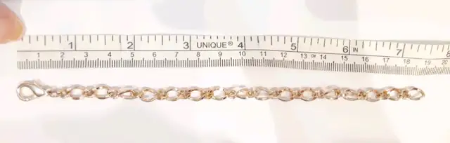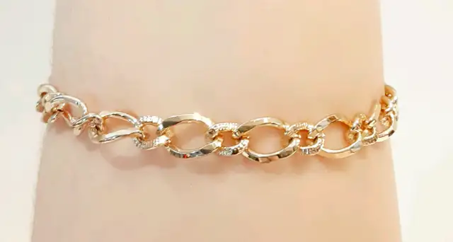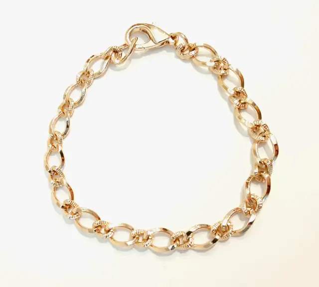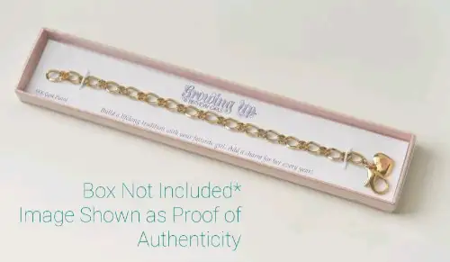 Beautiful 18kt Gold Plated, high quality Zinc Alloy Charm Bracelet from the Enesco Growing Up Girls line, meant to be used as a generational memory keepsake throughout the years. The line (sold at Hallmark) features multiple collectible charms sold separately that highlight different age milestones, as well as interests (teddy bears, hobbies, etc.) Like new condition, out of original packaging. Chunky link style chain with large lobster clasp closure. Missing an engraved "Growing Up" logo tag signant that featured an enamel pink heart on one side. Please see images for beautiful chain detailing as well as bracelet size. Would make a great gift for a child or adult with small wrist sizing. Please note: I have this same bracelet listed with the "Growing Up" tag signant (missing here) if you are interested. Please see that listing for details :) Available for pick up in Etobicoke. Thank you for reading :) I have more jewelry listed on my page.