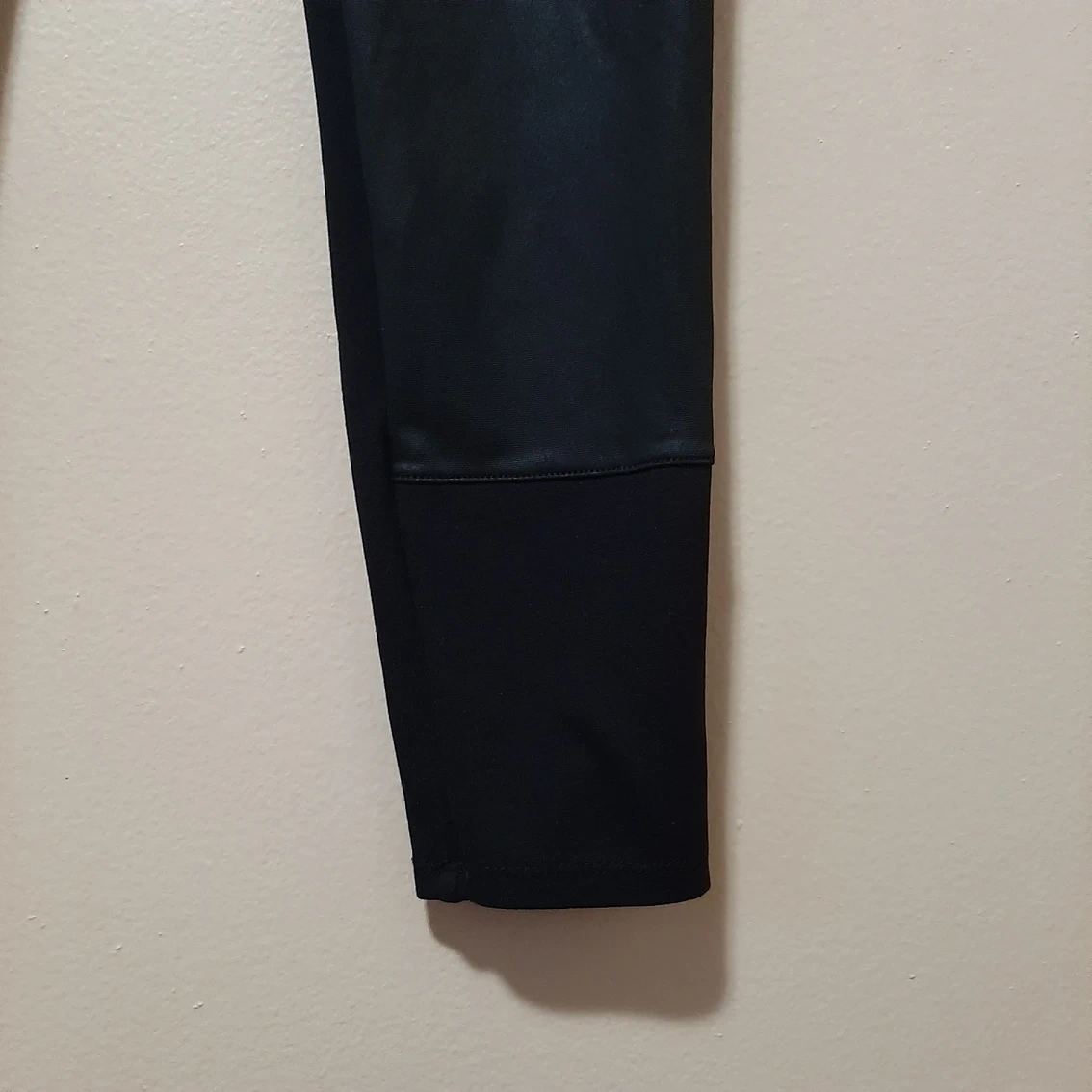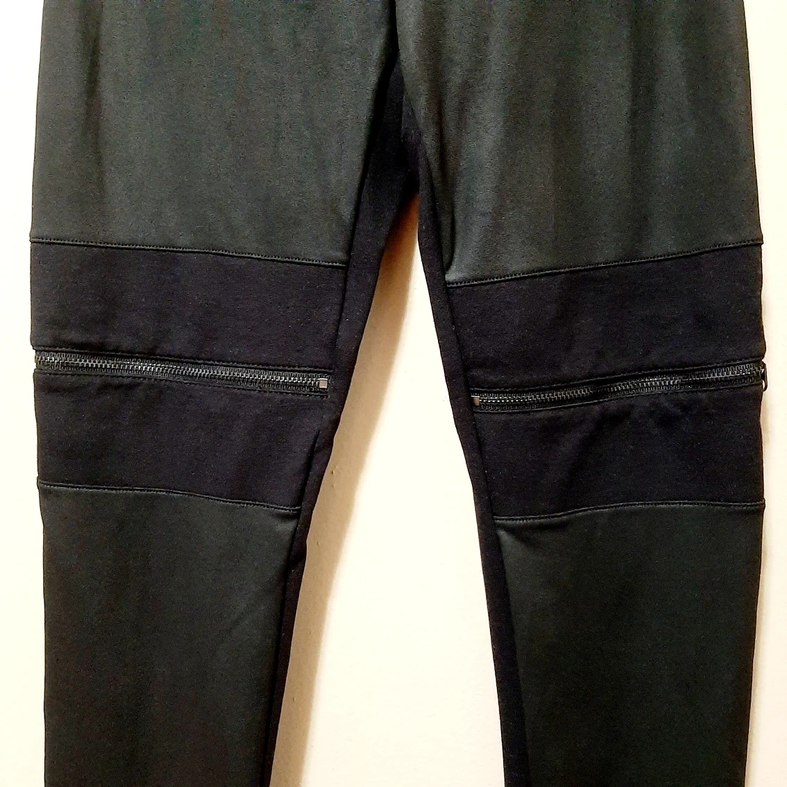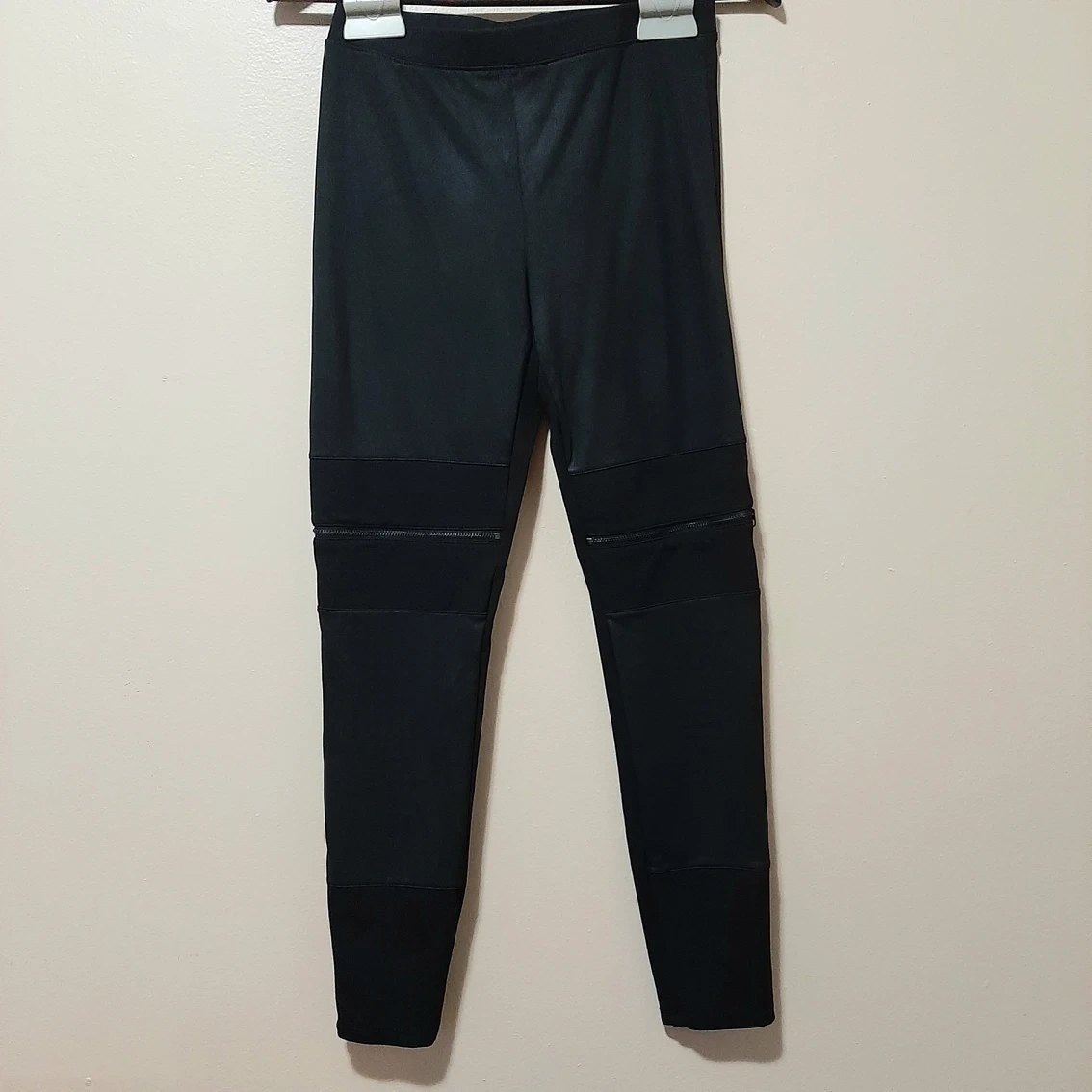 Casual and Trendy Black Leggings with Faux leather in the front and zipper on knee detail. Length 33.5 approx Waist 12.74 approx Hip 16 approx