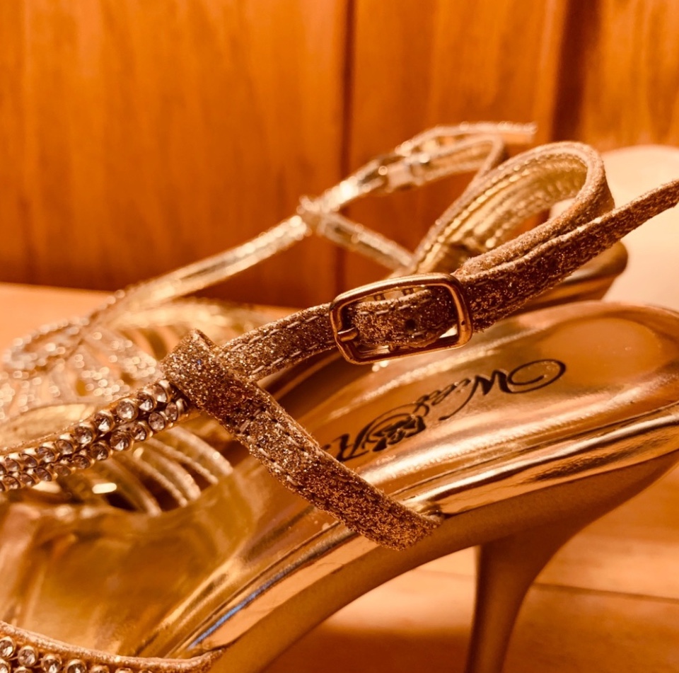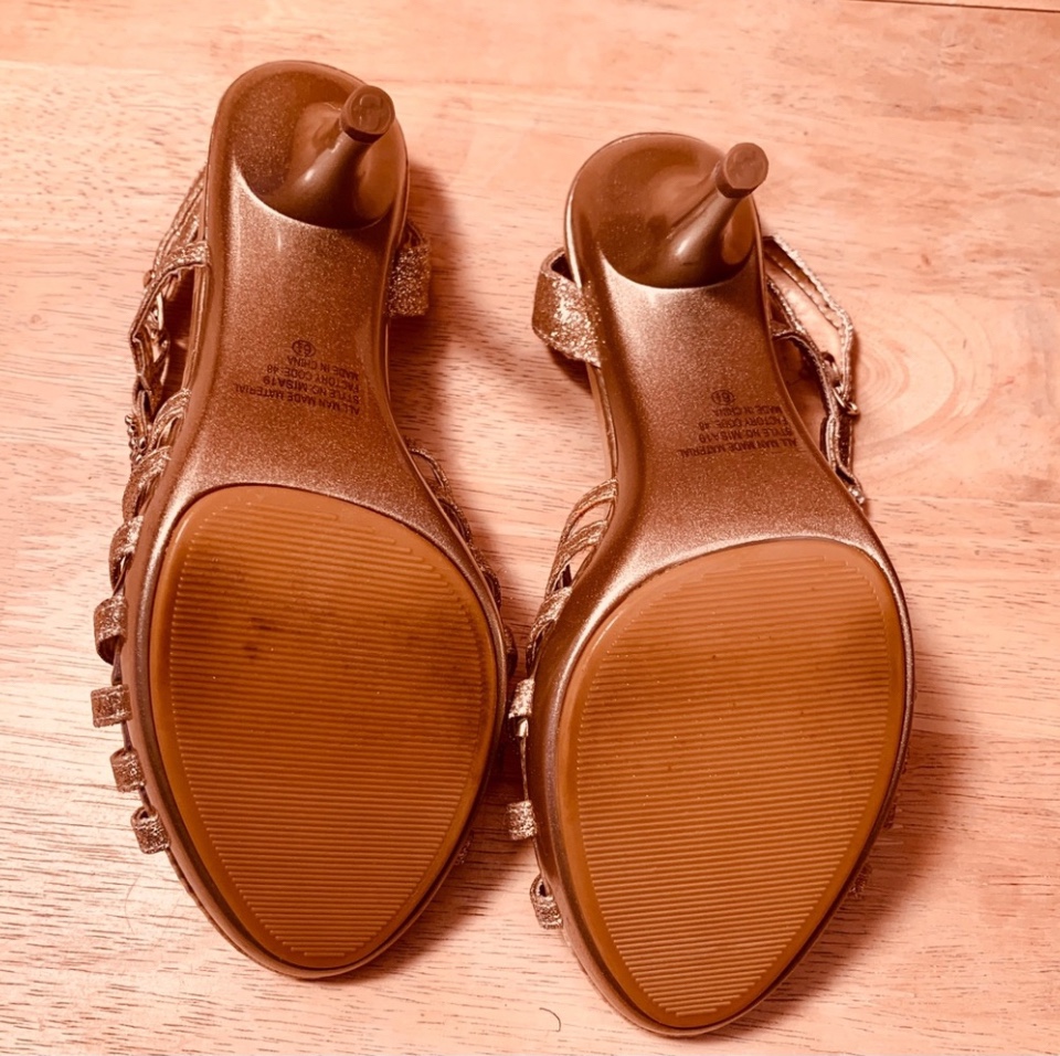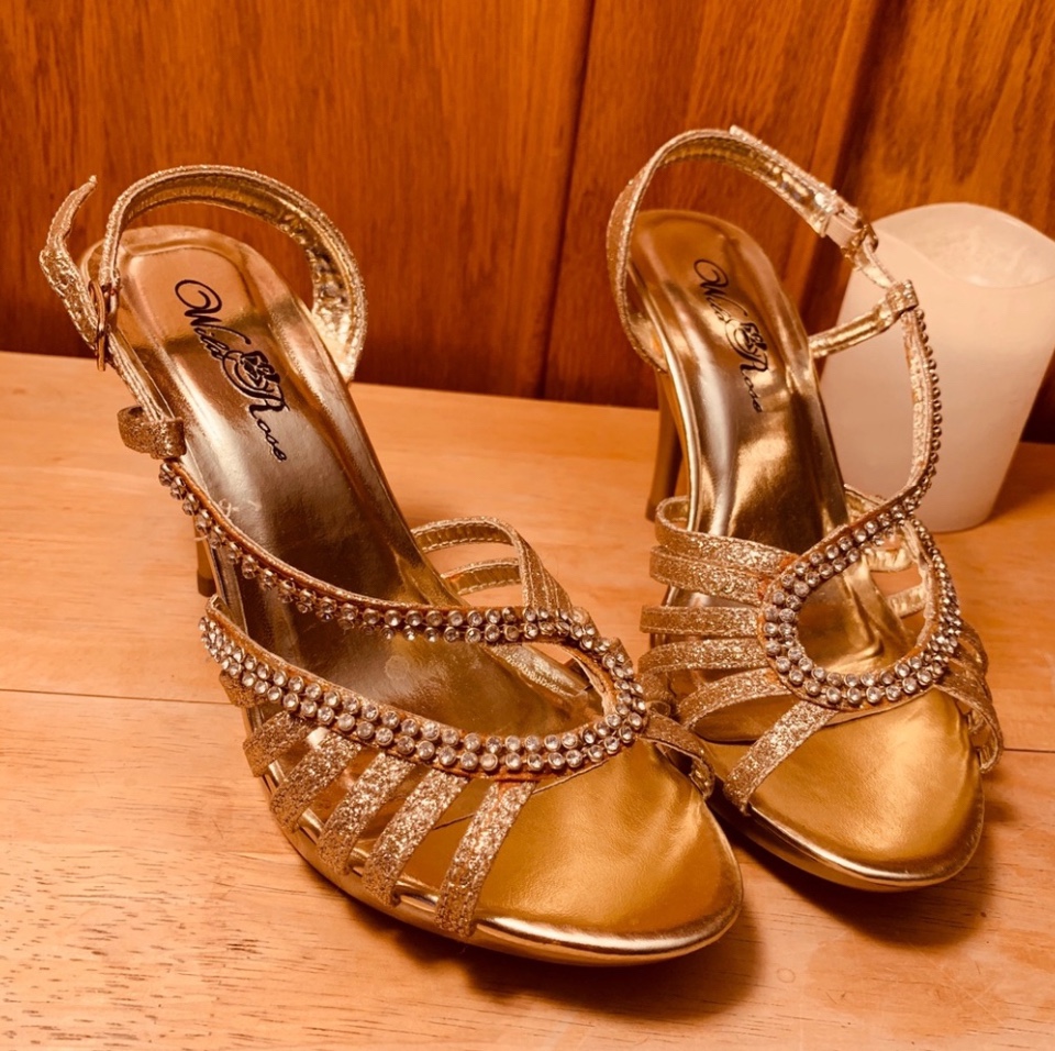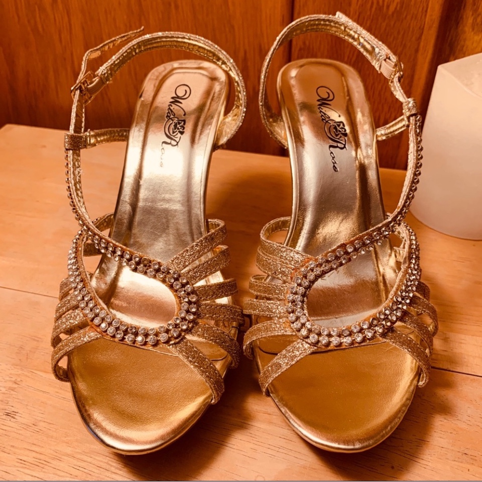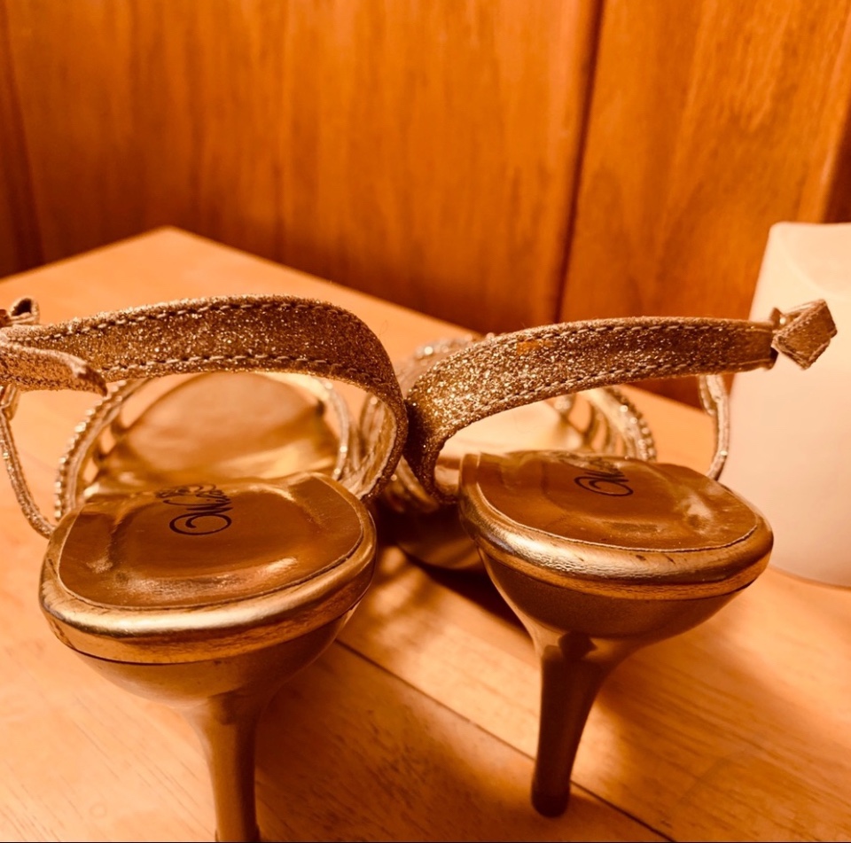 Open toe, strappy, metallic gold slingback heels with white rhinestones adorning the straps. All man-made materials. Style: Misa19. Heel height is 3 inches. Bought in Las Vegas and never ended up wearing them.