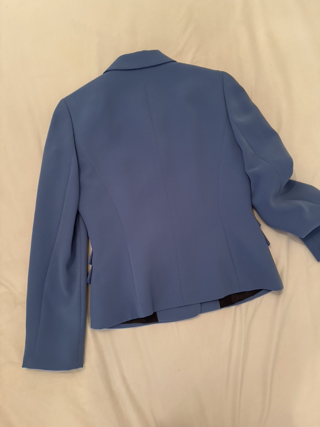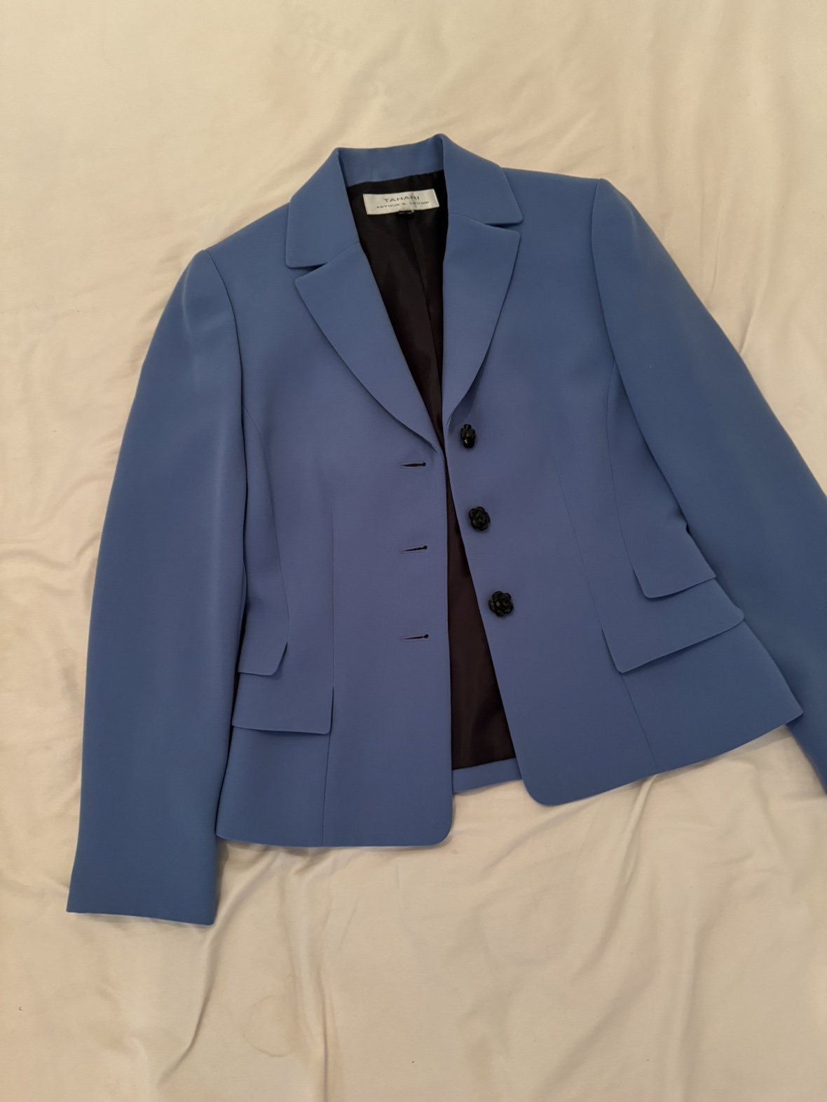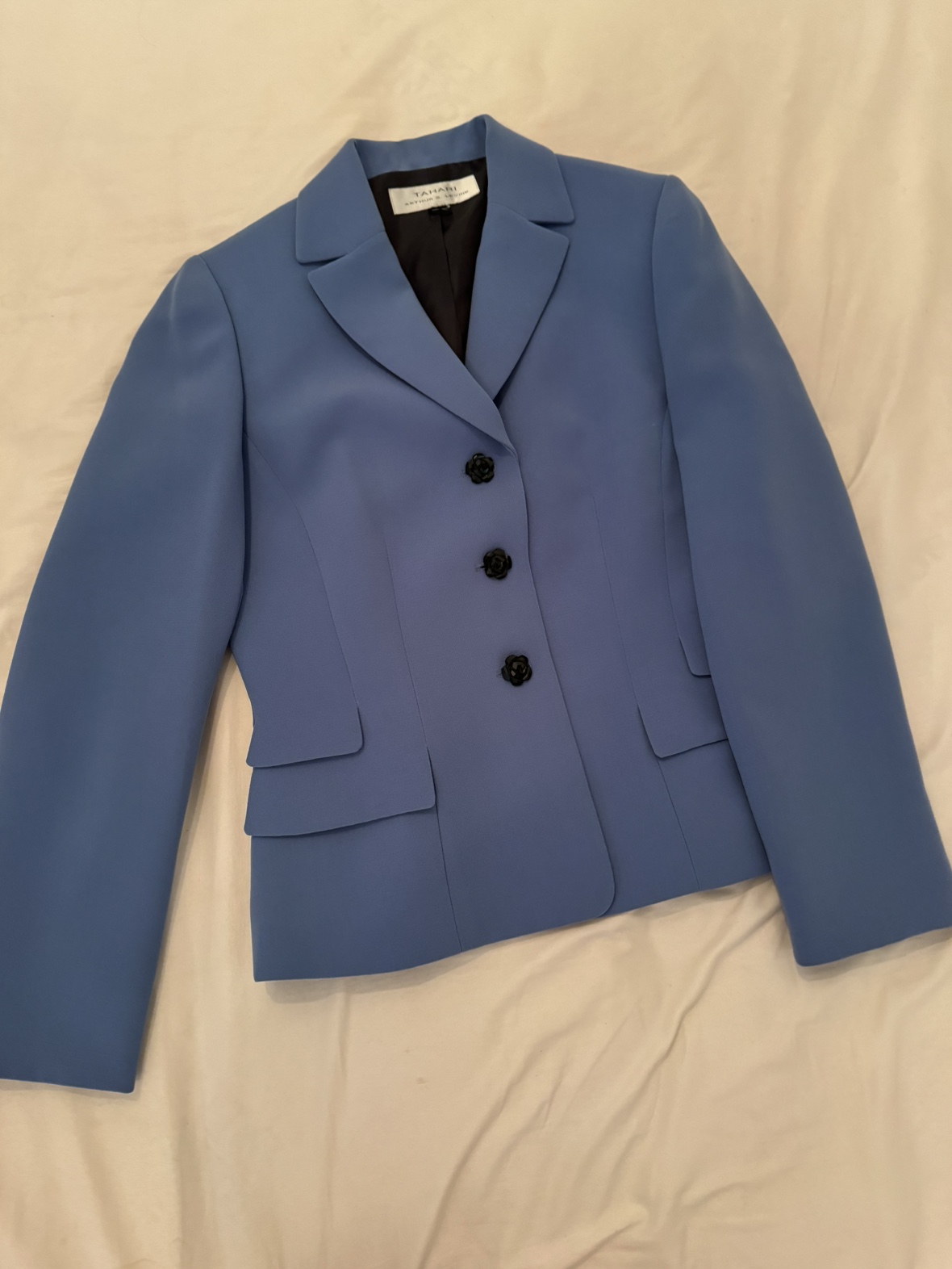 Blue short & fitted office wear blazer with cute flower buttons