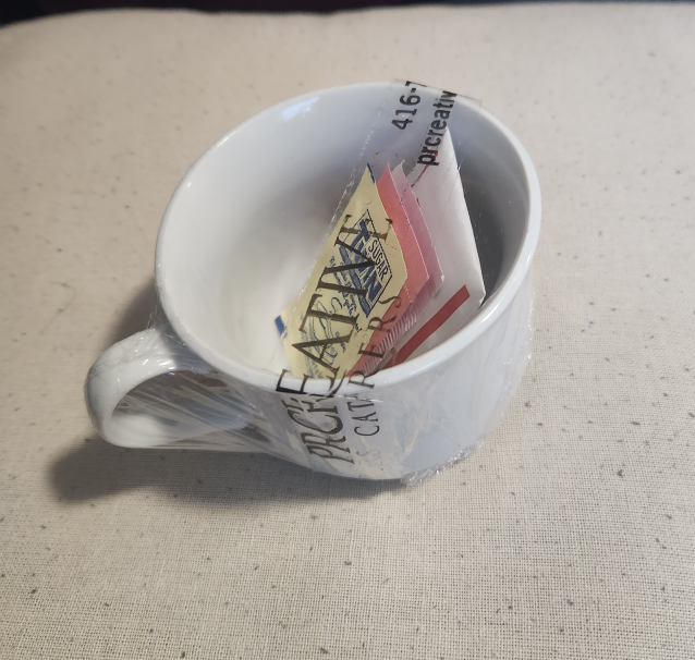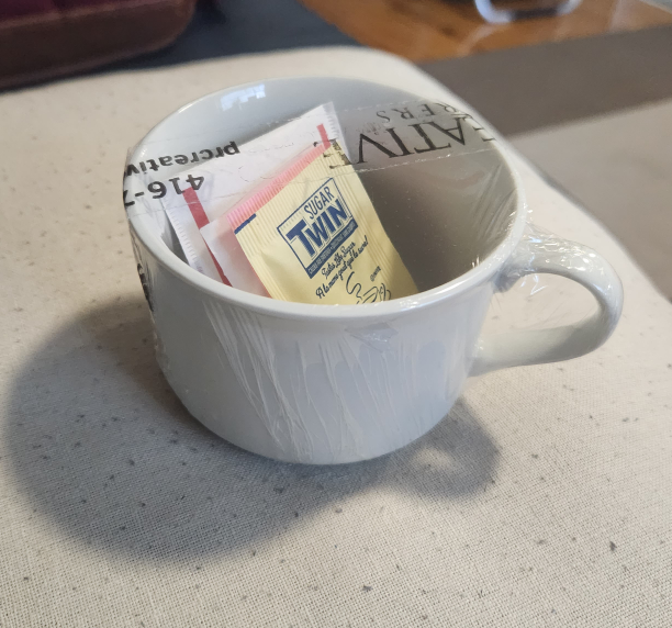 # freecycle Kosher tea mug with tea, sugar, and 2 different sweeteners I'm giving away because I got it for free, and I don't need more mugs Pick up only