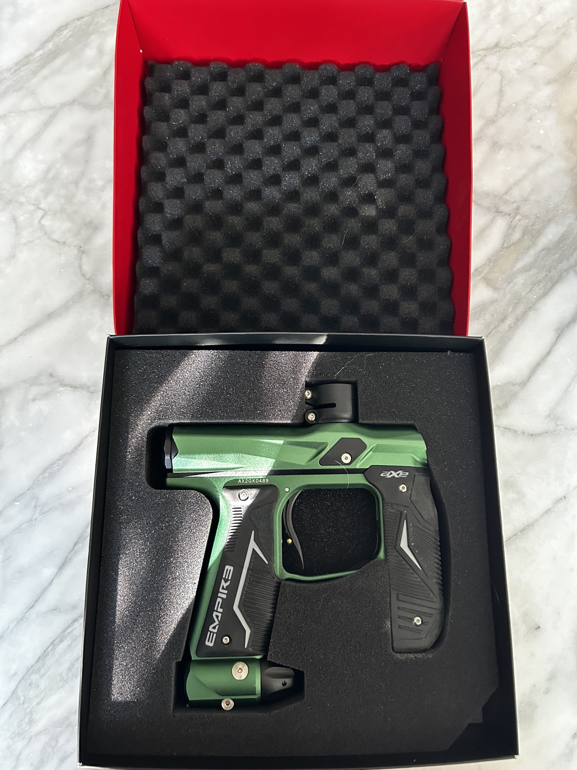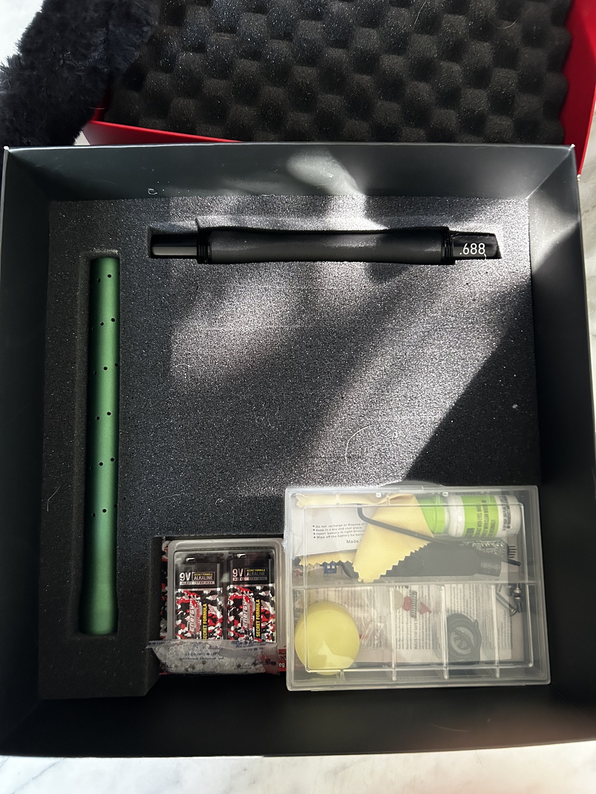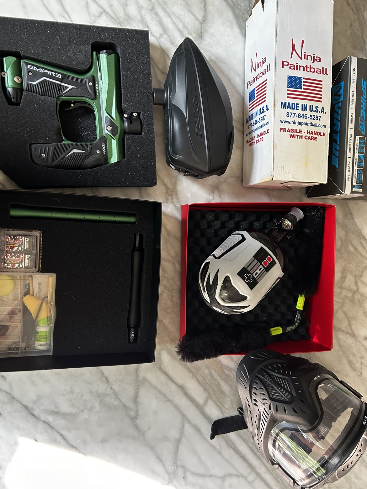 Includes what you see in pictures, got knee surgery so I can’t run anymore so unfortunately I have to leave the sport :( Everything was used a handful of times last year and is in perfect condition! Axe 2.0 with Redline board Ninja 50/4500 with Pro V2 regulator Virtue Spire automatic hopper Barrel cleaner O-ring kit Extra batteries HK army face mask