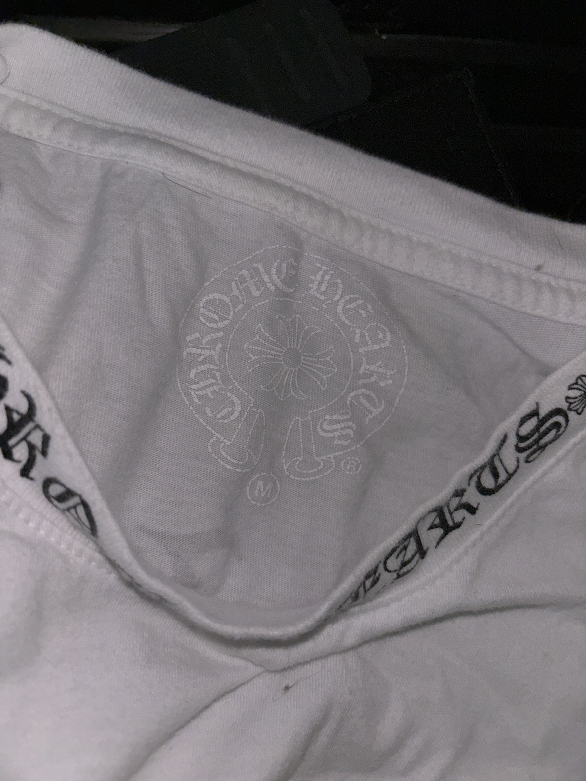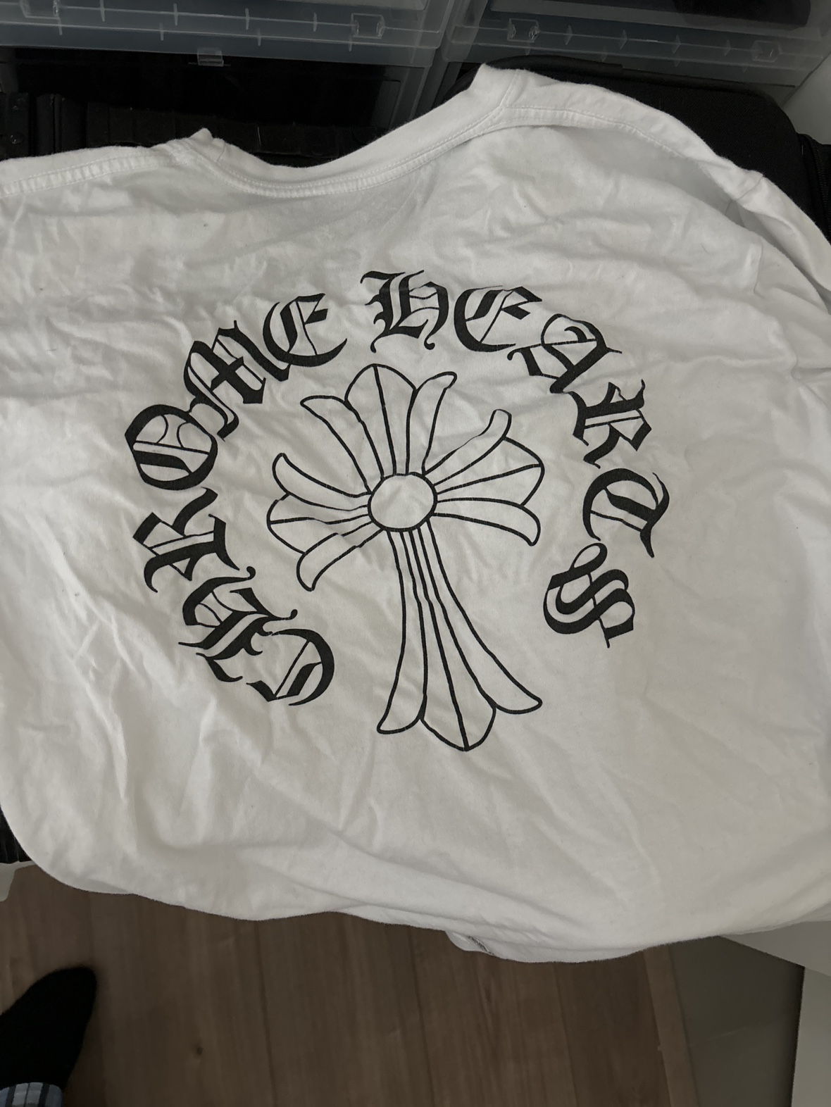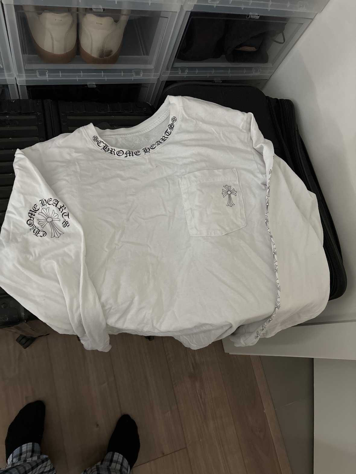 Authentic chrome hearts longsleeve AUTHENTICITY GUARANTEE, full work on arms, back and pocket and logo on front. Wrinkly and will be dry cleaned before pickup. This shirt does not have any stains or marks or rips. Again, 250$ for a chrome hearts shirt will not find that price.