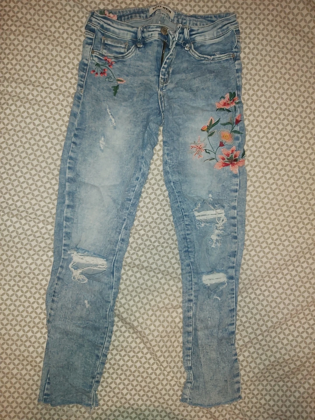 Blue embroided jeans Brand: Tally WeiJL, Size: 36 Black crop skinny jeans Brand: Ralph Lauren, Size: Not sure but it should be size 36 Pink shorts Brand because I removed the tag & Size unsure but the size should be 36 too Black short overalls Brand: Tally WeiJL, Size: 36 Pickup only